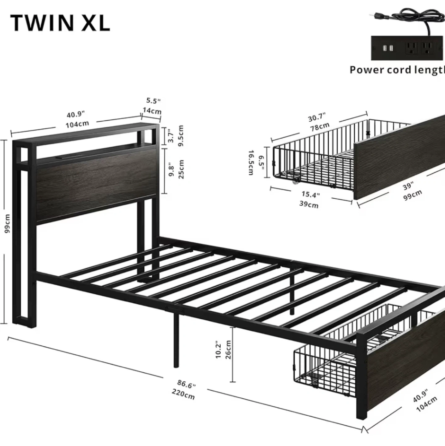 Selling a Twin XL bed frame! It features a sleek design with a storage drawer. The dimensions are approximately 40.9" (104cm) wide and 86.6" (220cm) long. The headboard is about 40.9" (104cm) high, 5.5" (14cm) deep, and 9.8" (25cm) tall. The storage drawer dimensions are approximately 30.7" (78cm) wide, 16.5" (42cm) high, and 15.4" (39cm) deep. Perfect for adding extra storage to your bedroom!