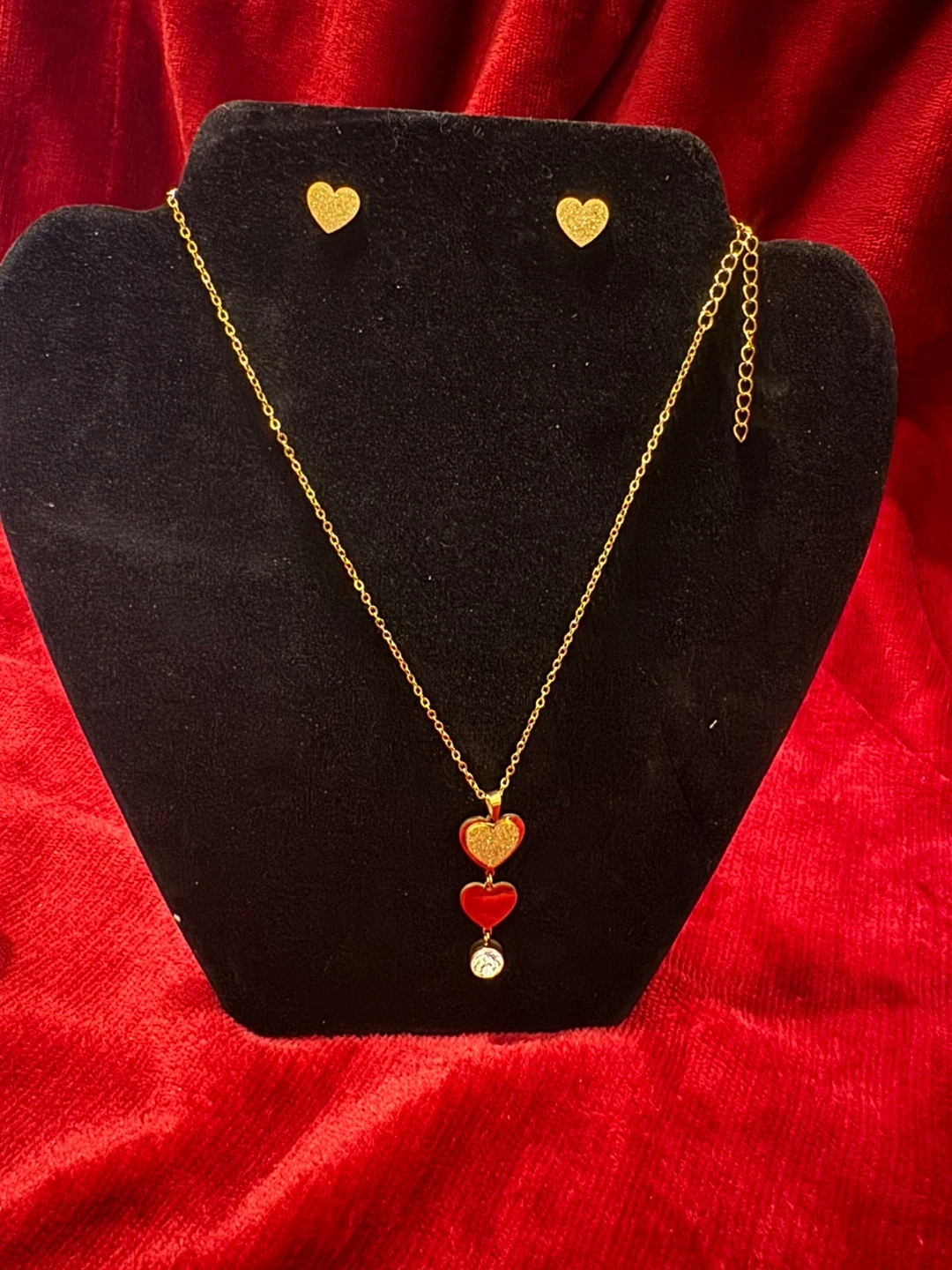 This is a gold tone pendant necklace with three heart charms and matching stud earrings. It's a lovely set for accessorizing. Great for a gift!