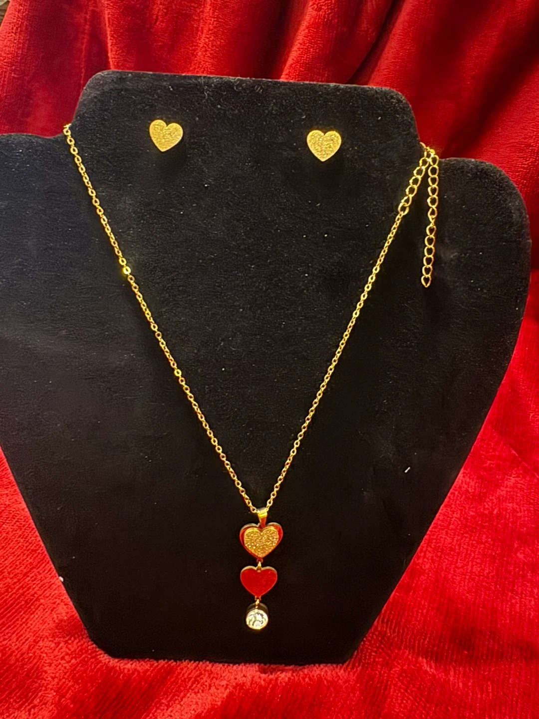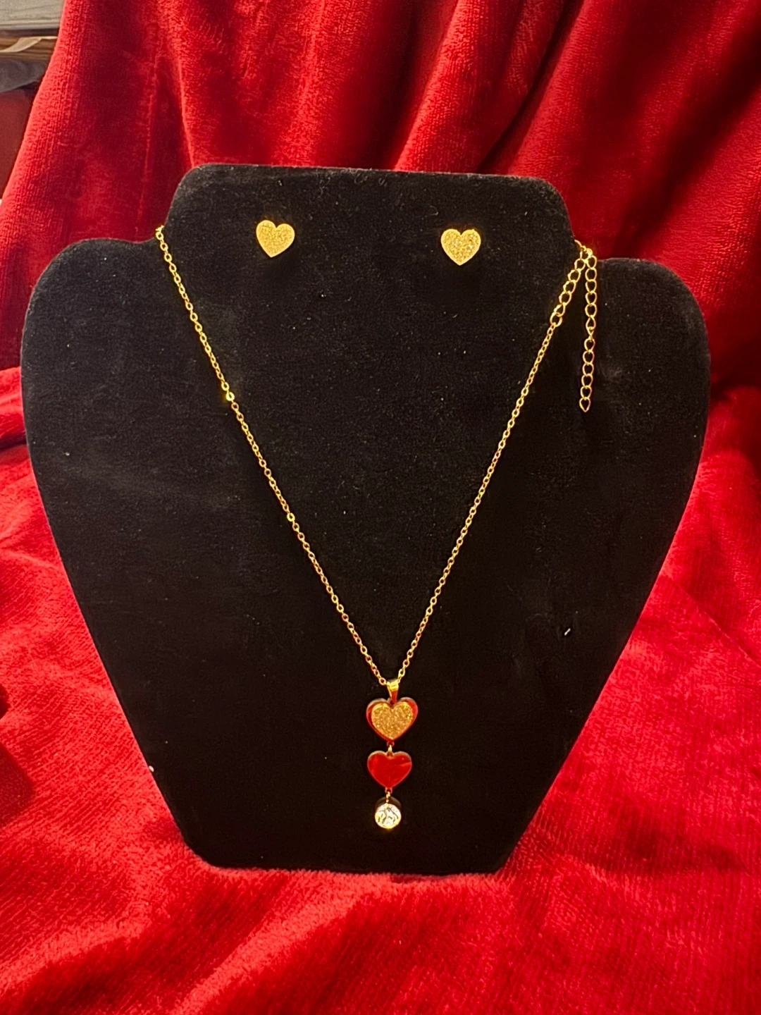 This is a gold tone pendant necklace with three heart charms and matching stud earrings. It's a lovely set for accessorizing. Great for a gift!