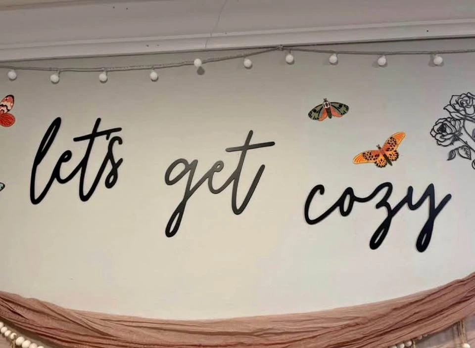 Cute black cursive wall letters that spell 'let's get cozy'. Great for bedroom or living room decor.