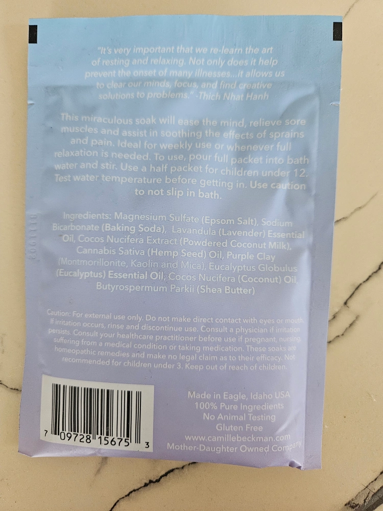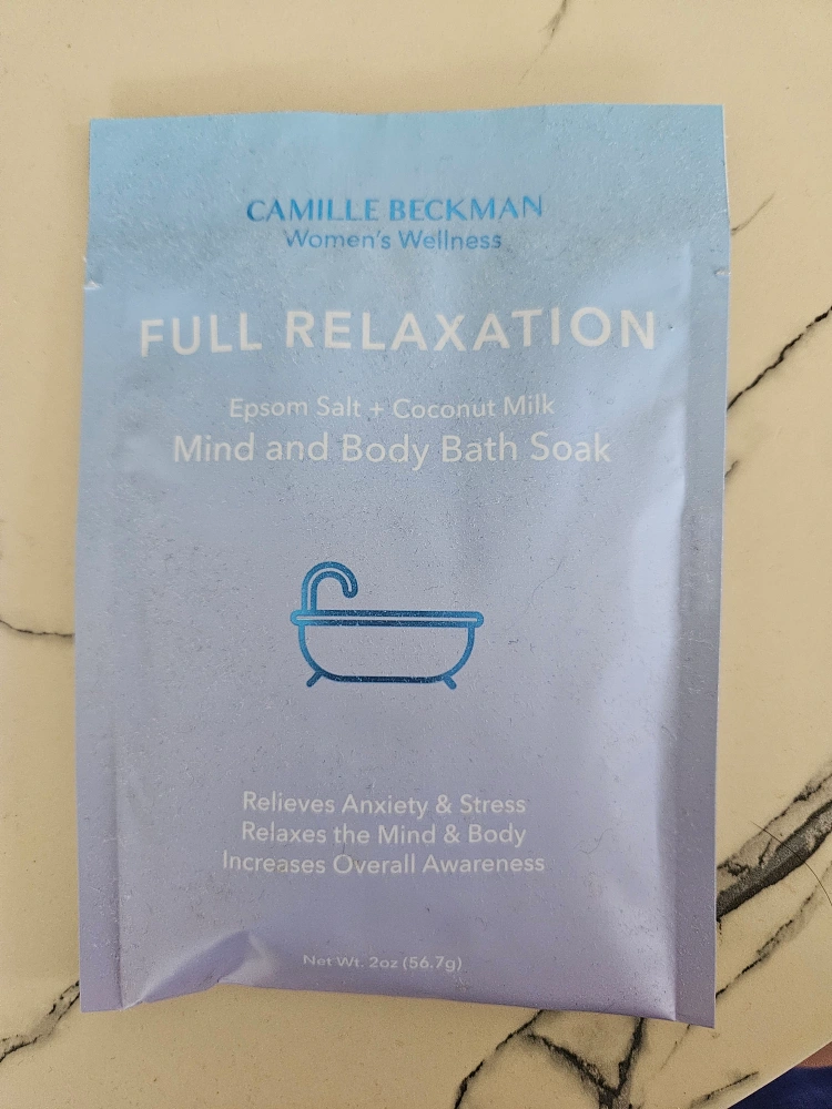 This Camille Beckman Full Relaxation bath soak helps relieve anxiety and stress and increases overall awareness. It contains Epsom salt and coconut milk for a soothing mind and body experience. Made with 100% pure ingredients and is gluten free!