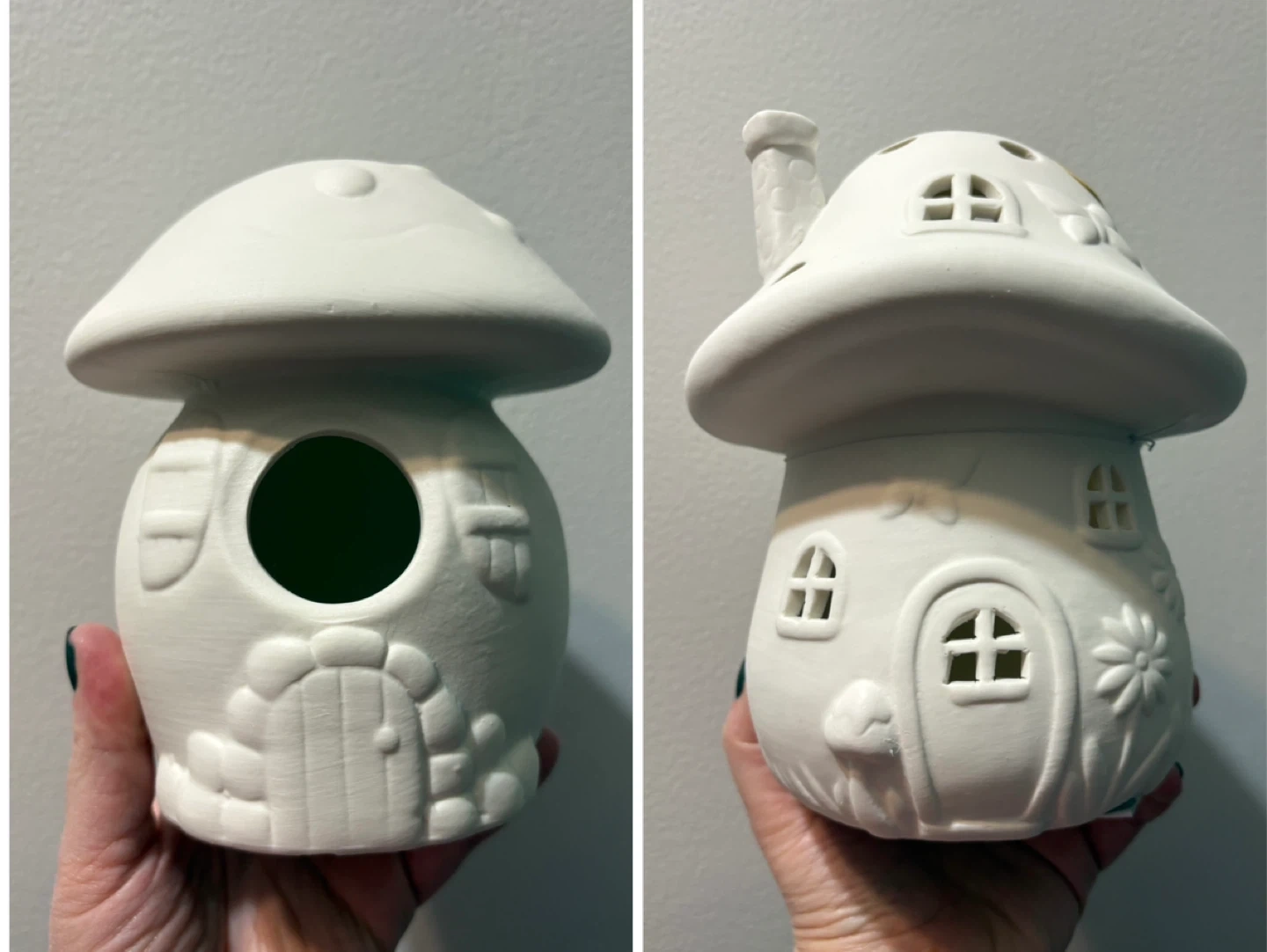 This is an unpainted ceramic mushroom house, ready for your creative touch! It's perfect for painting and decorating. Its whimsical design makes it a charming addition to any space.