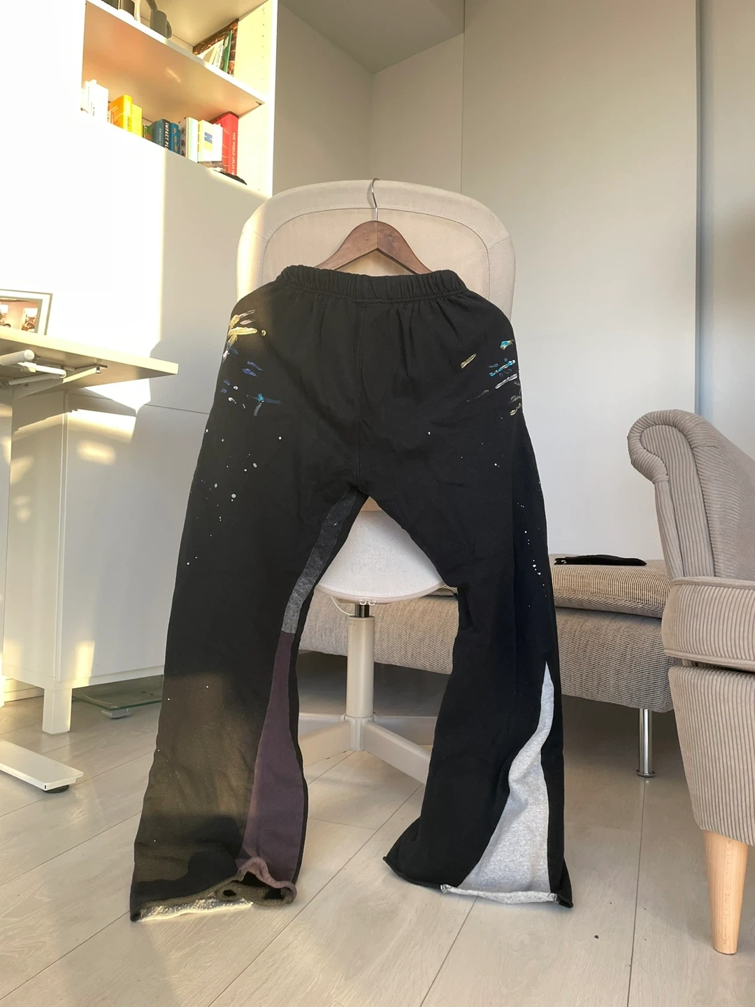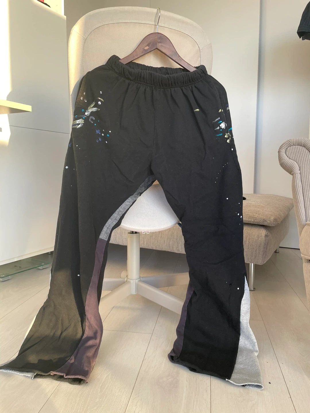 Selling a pair of black sweatpants. They have a unique design with paint splatter and colour blocking on the sides. Comfortable and stylish for casual wear