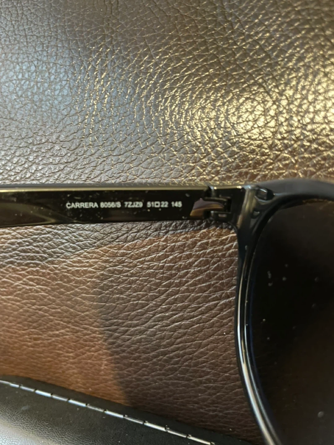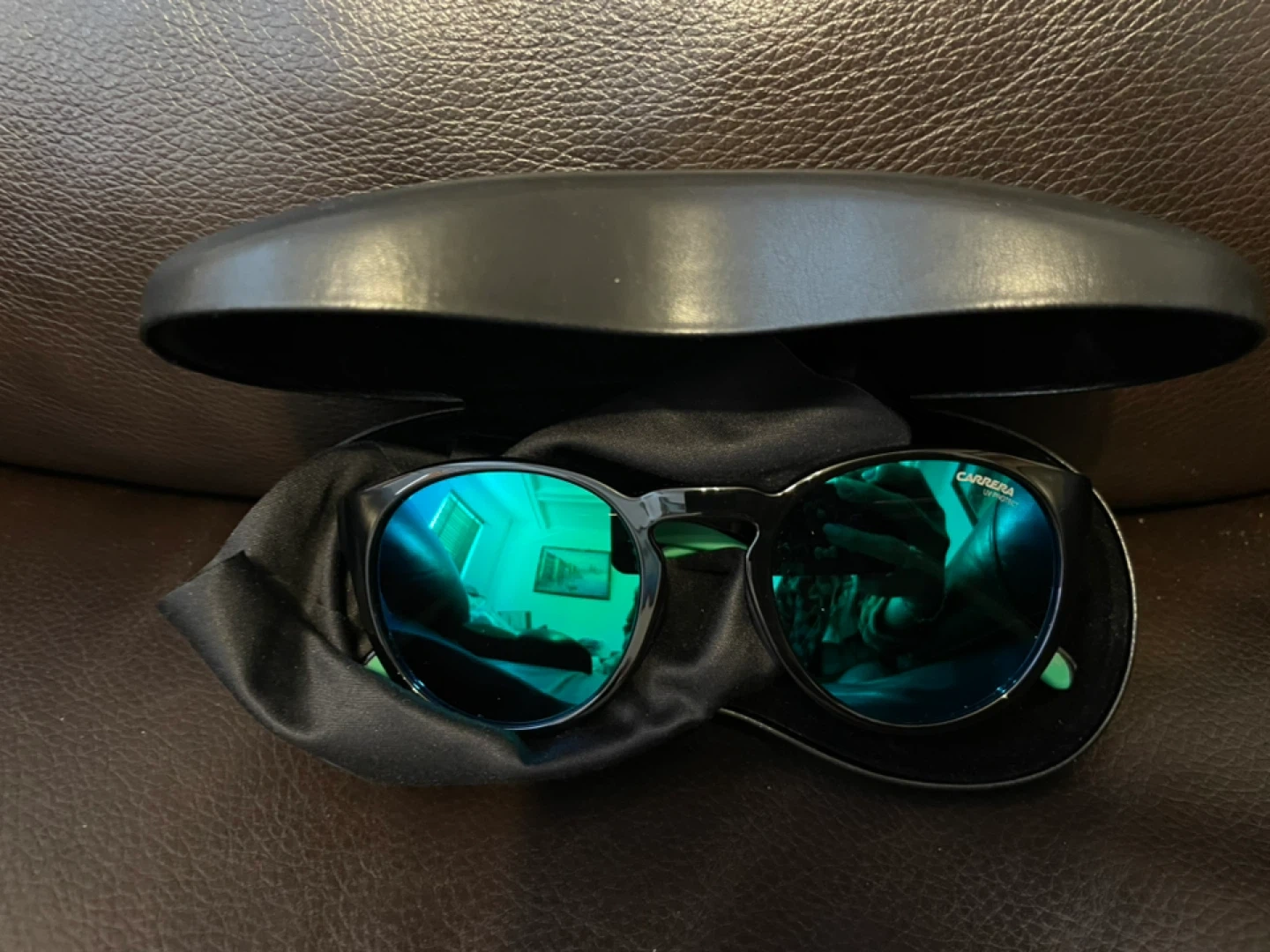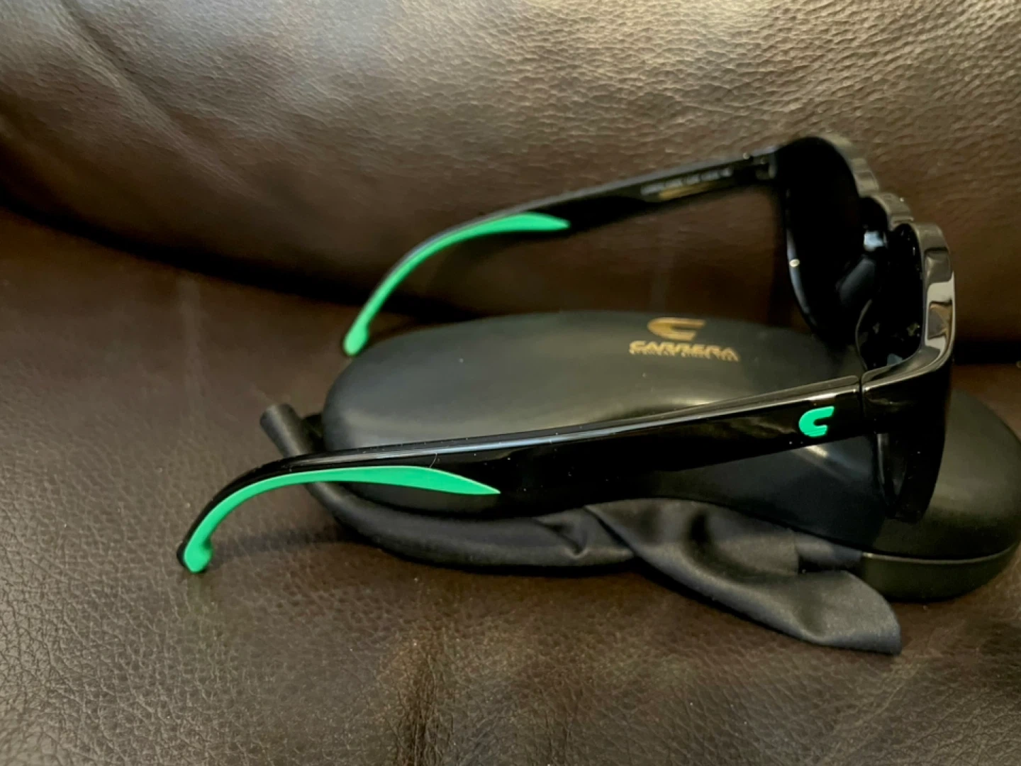 Selling a pair of Carrera 6056/S sunglasses. They are black with green accents. Includes the case and cleaning cloth. New
