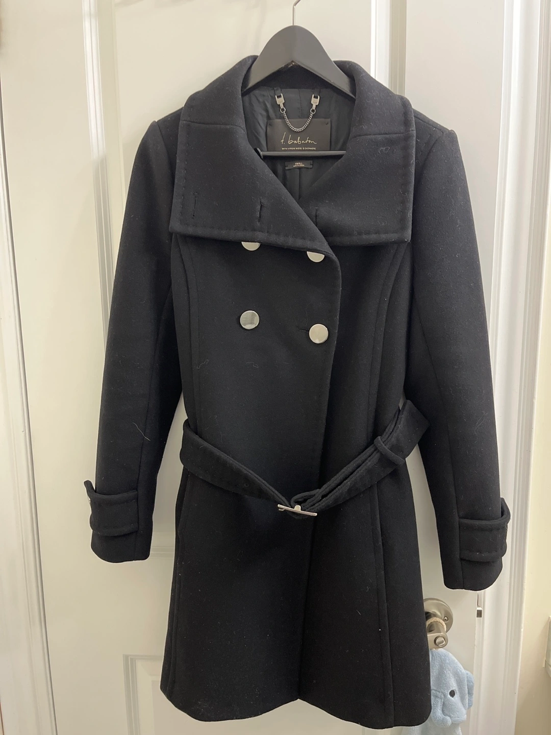 92Women's black wool peacoat. Double-breasted with silver buttons. Features a self-belt. Classic style.