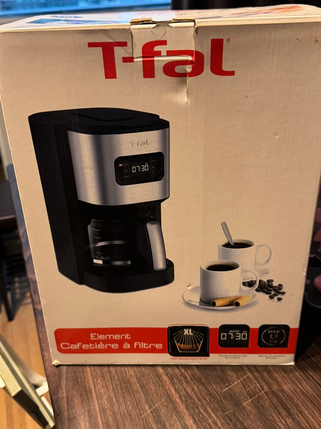 Selling a T-Fal Element XL filter coffee maker! It's in great condition and ready to brew your favourite coffee. It can brew up to 12 cups at once, perfect for families or gatherings. The box is included!