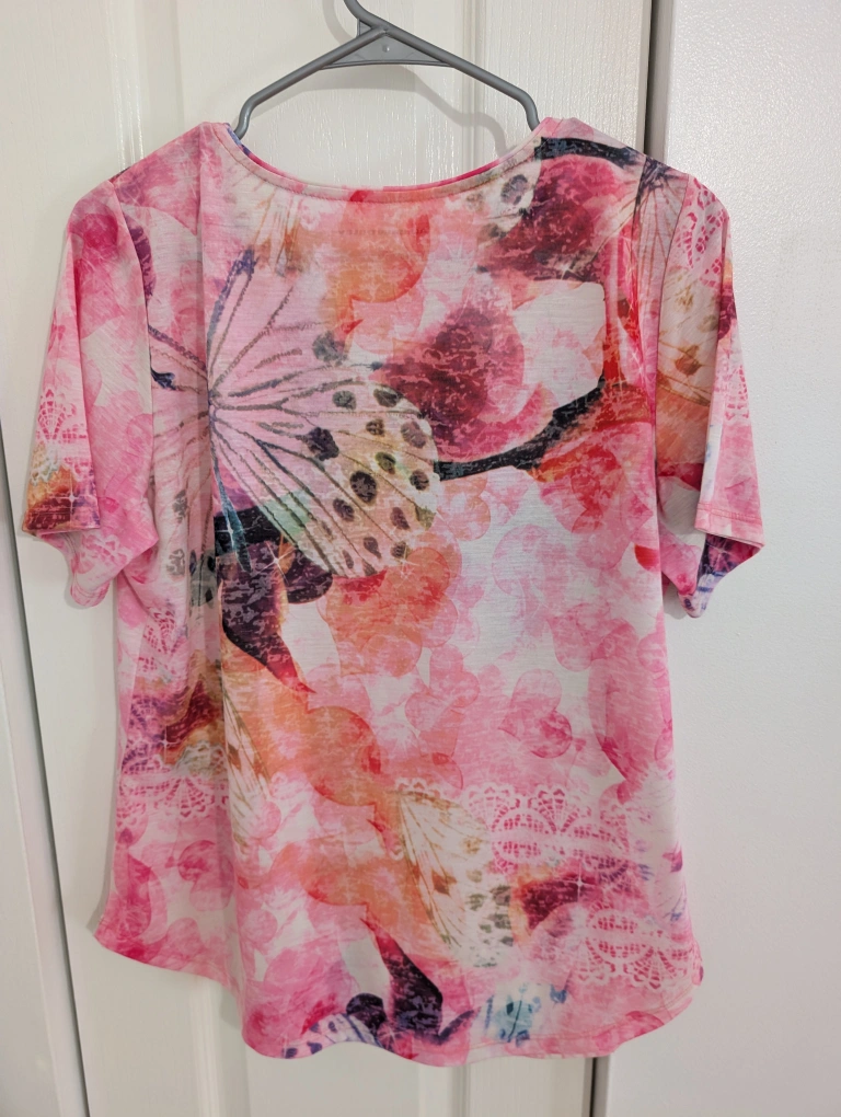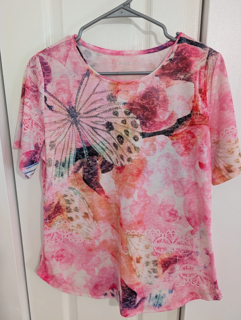 213Round neck t-shirt. Features a pink floral pattern. Short sleeves.