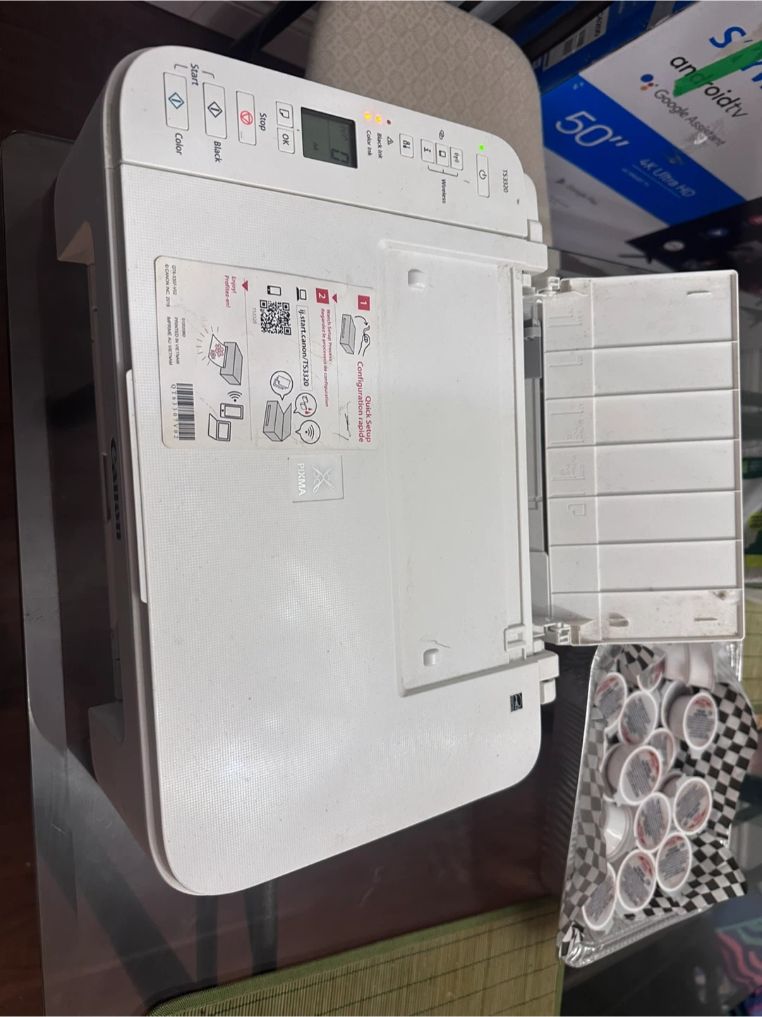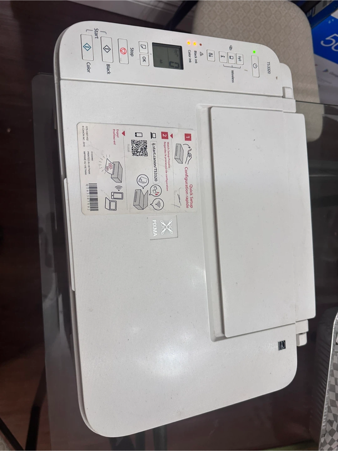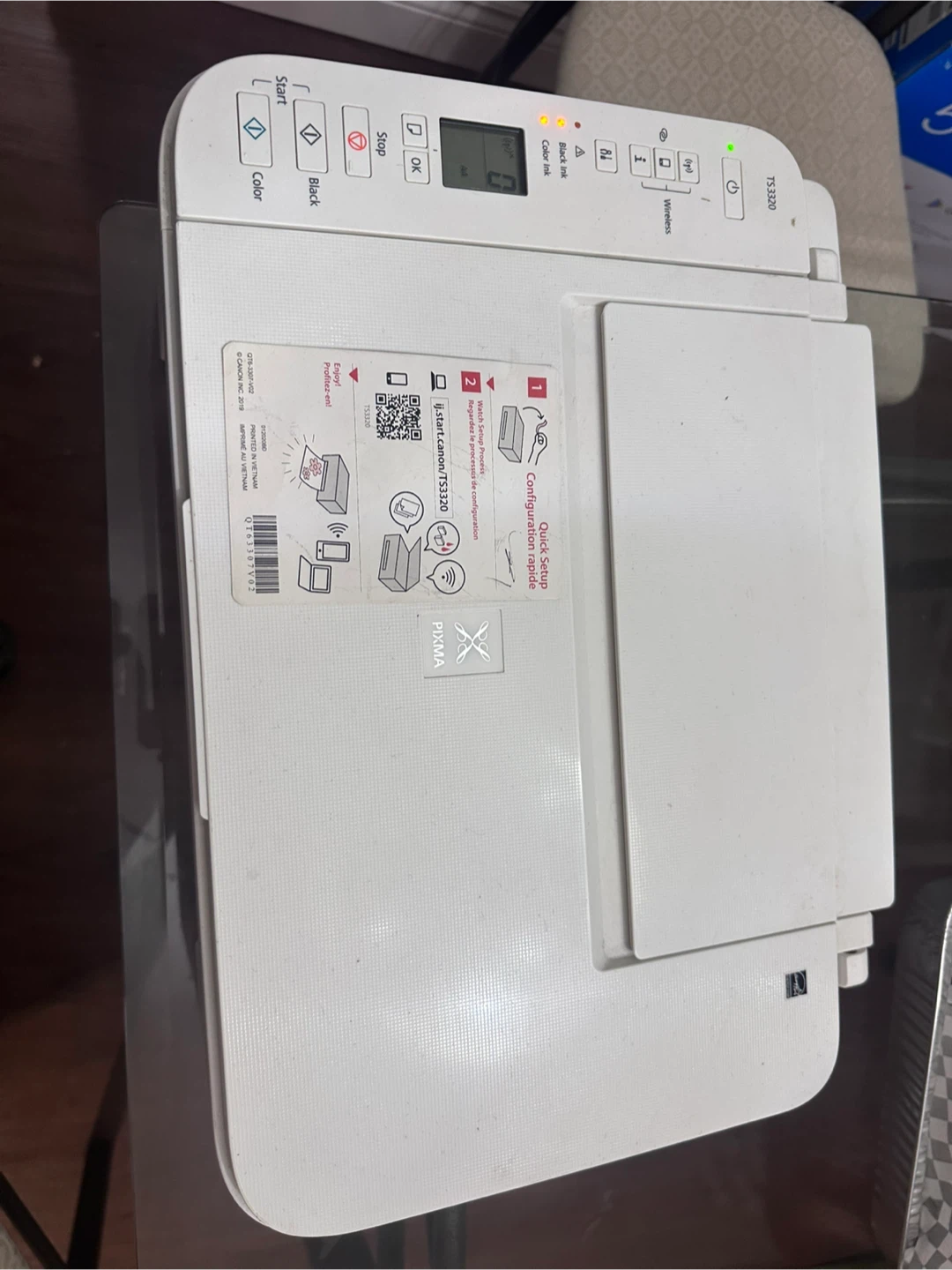 This is a white Canon PIXMA TS3320 all-in-one printer. It's a compact device that can print, scan, and copy. It supports wireless printing for convenience.