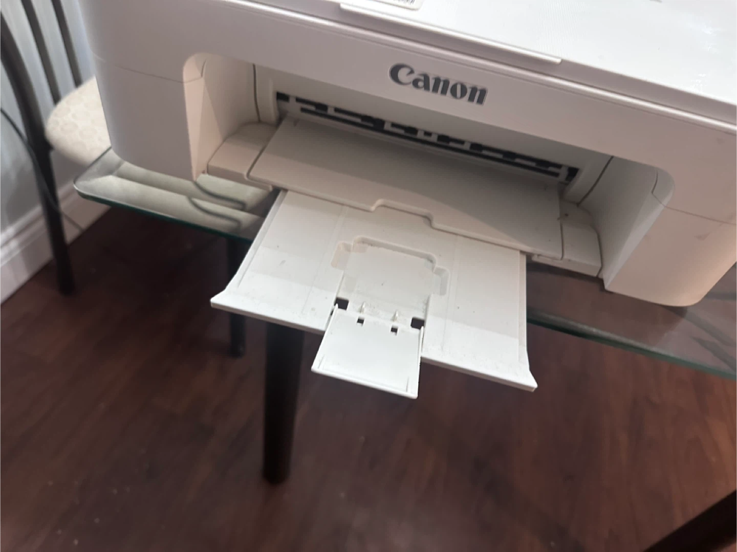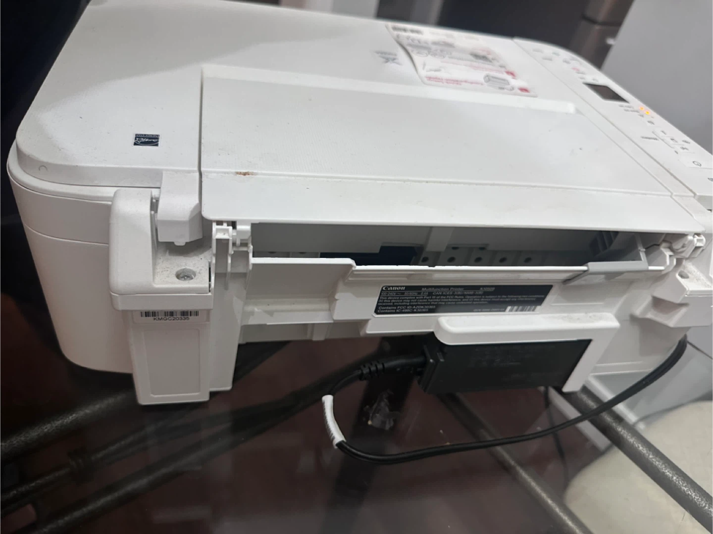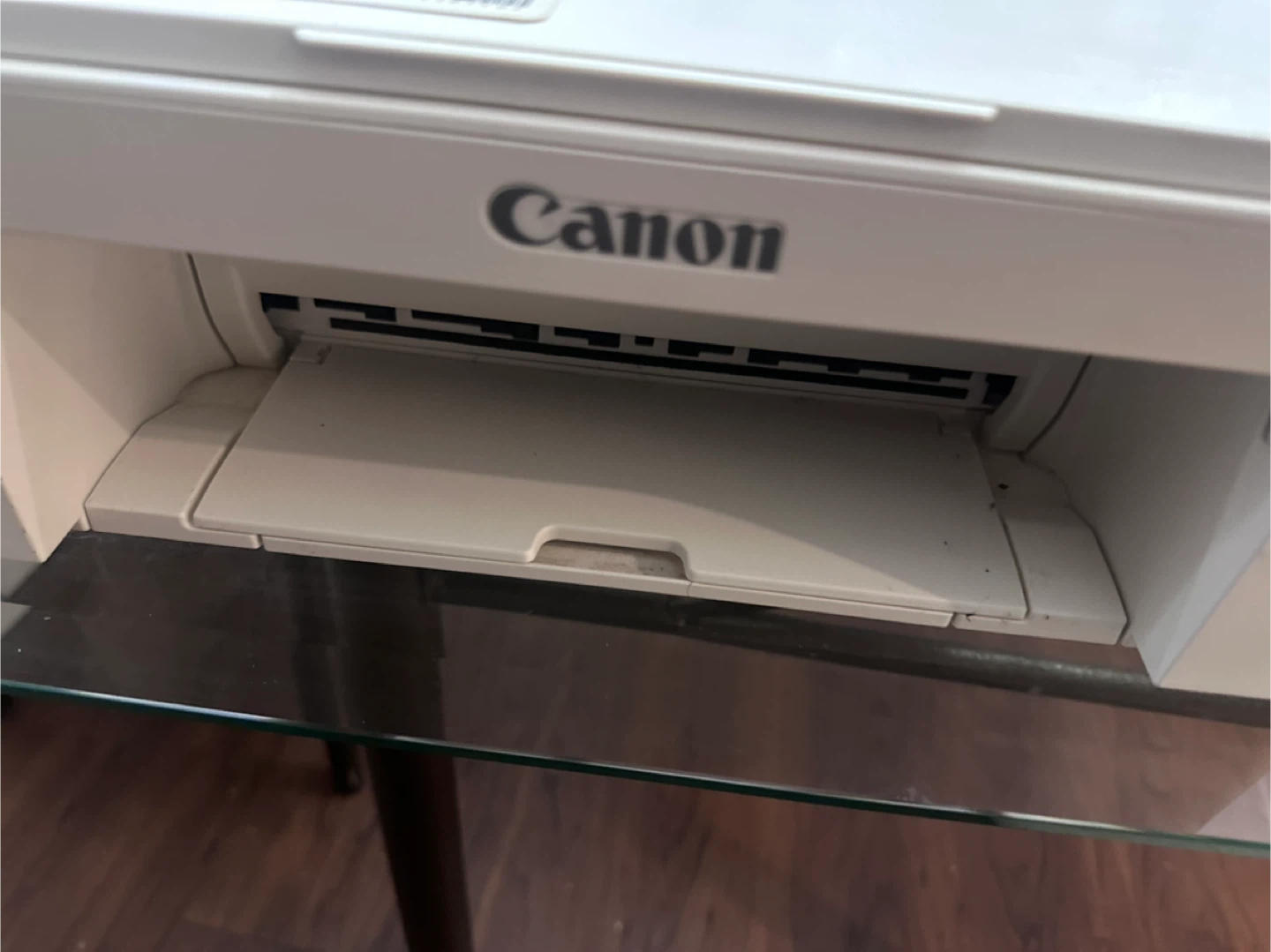 This is a white Canon PIXMA TS3320 all-in-one printer. It's a compact device that can print, scan, and copy. It supports wireless printing for convenience.