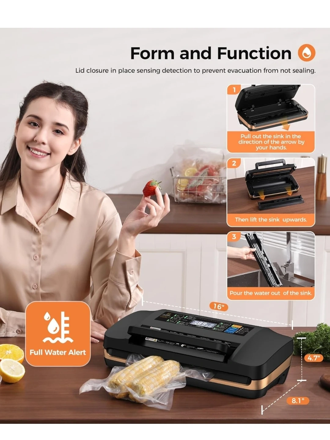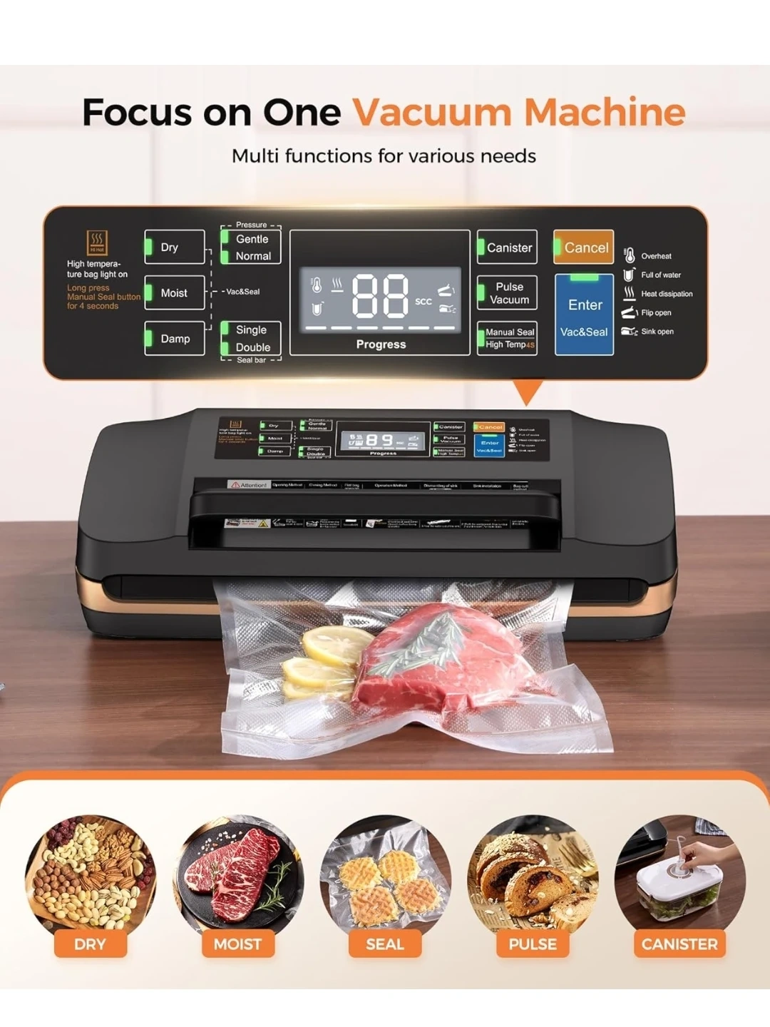 This vacuum sealer machine offers dry, moist, and gentle modes for various food types. It includes a built-in cutter and bag storage. The dimensions are 16" x 8.1" x 4.7".