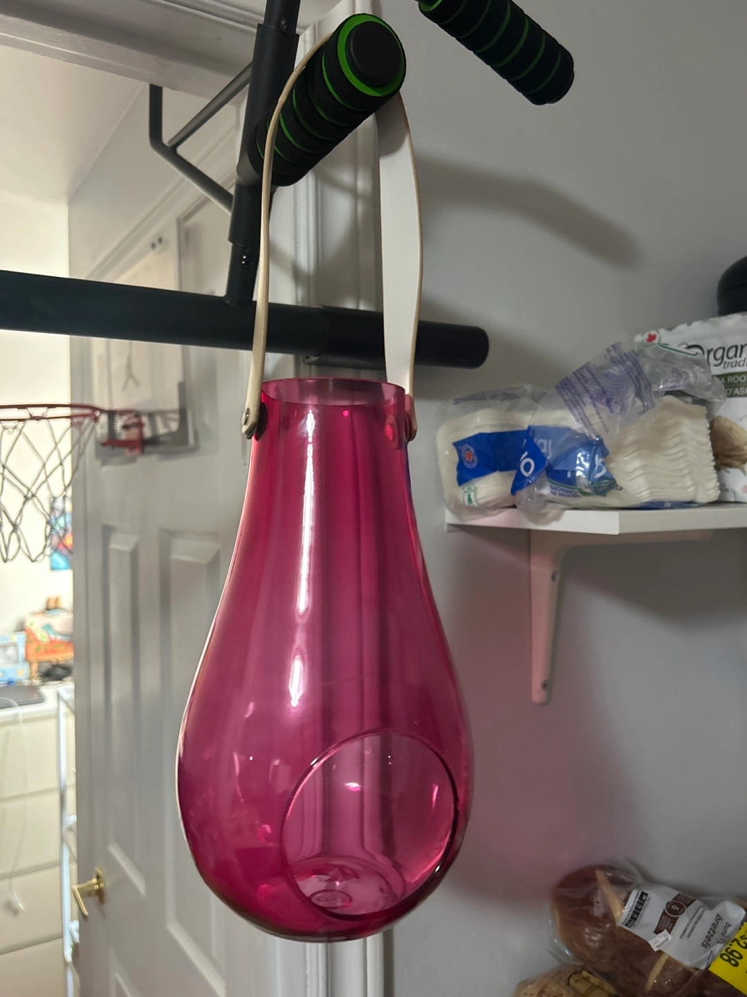 Unique pink glass vase. Features a cream-coloured leather carrying handle. Perfect for displaying flowers or as a decorative accent. Lightweight and easy to hang.