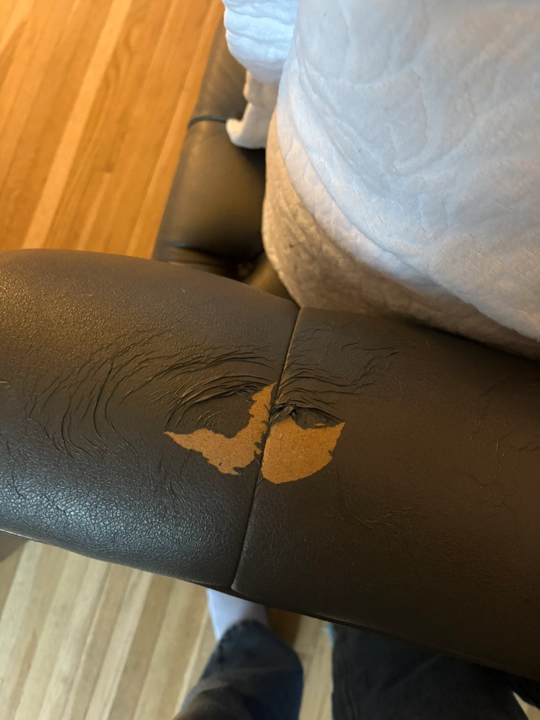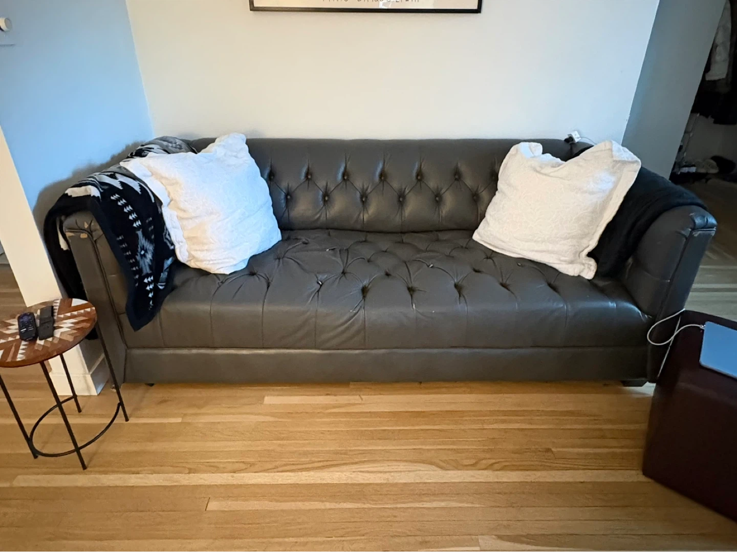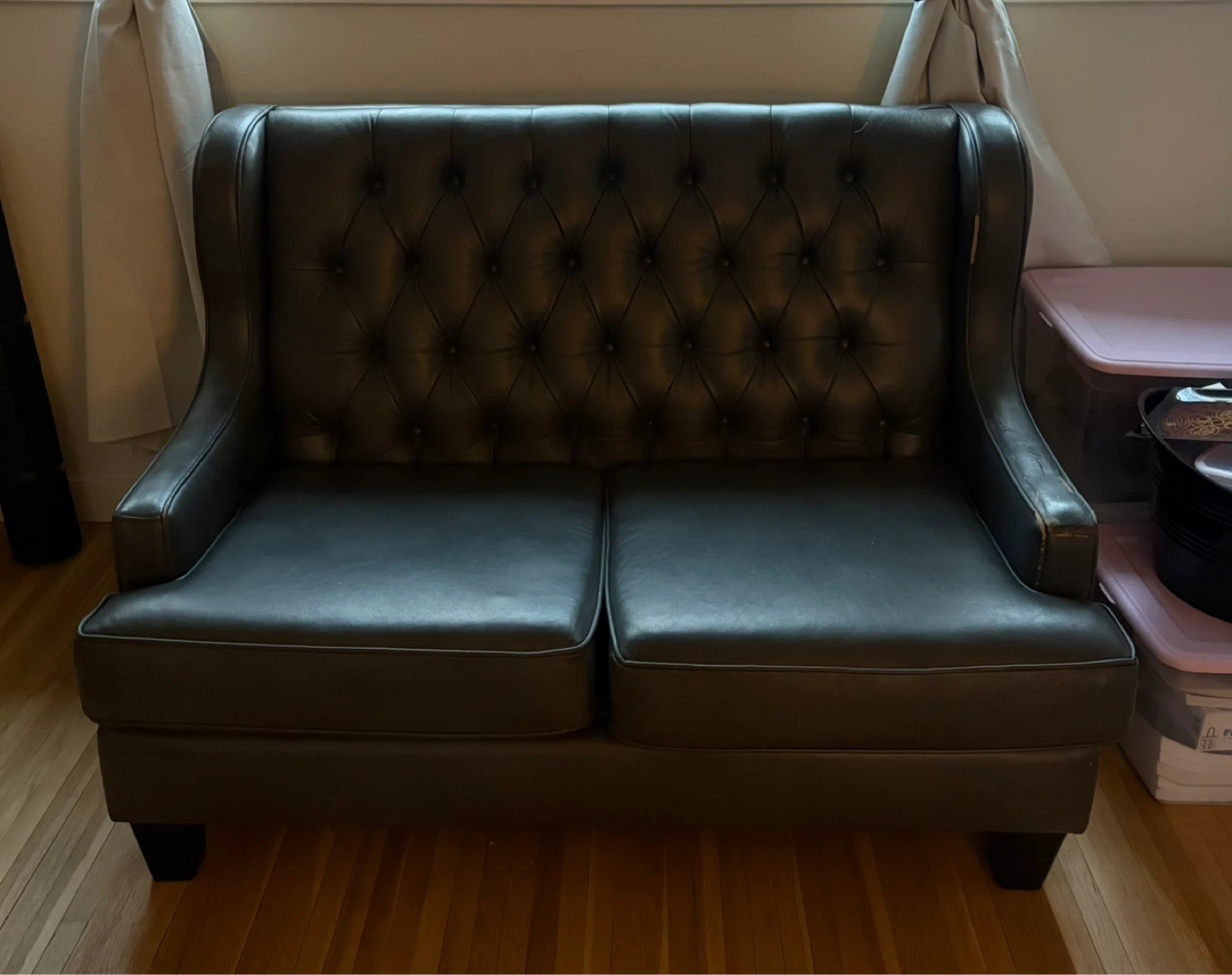 Dark grey tufted loveseat with faux leather upholstery. Shows wear and tear with peeling on the arms and back. Great for a den or basement. Moving out need gone asap (Pick up only)