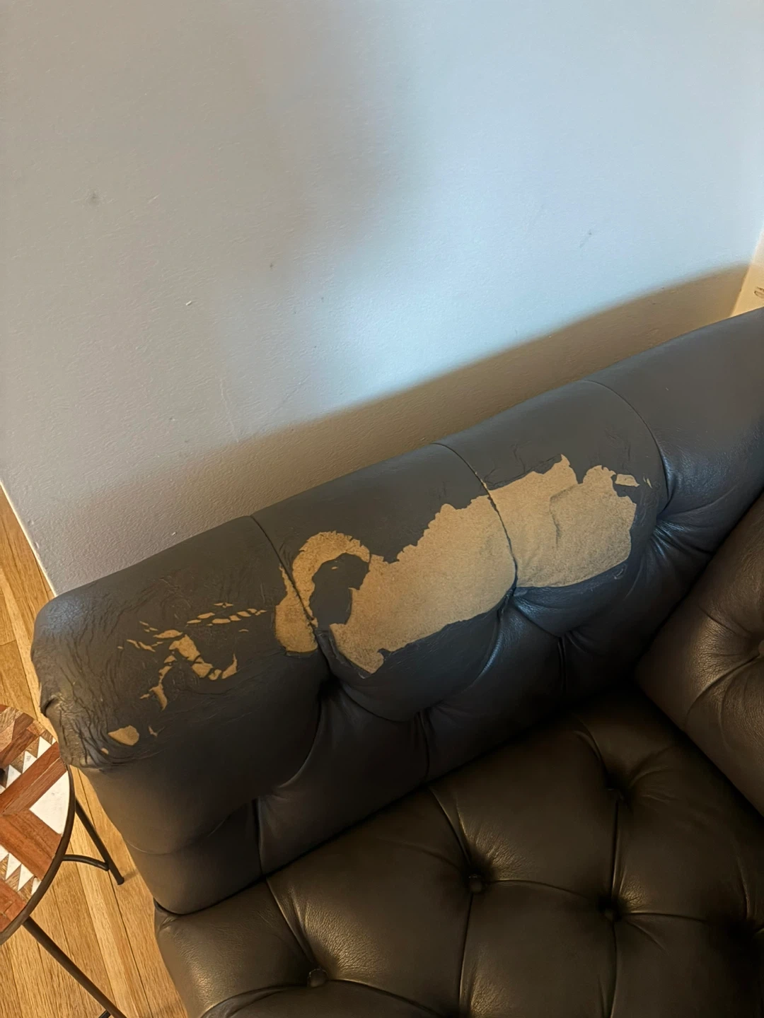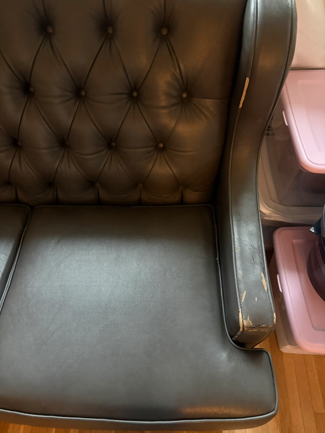 Dark grey tufted loveseat with faux leather upholstery. Shows wear and tear with peeling on the arms and back. Great for a den or basement. Moving out need gone asap (Pick up only)