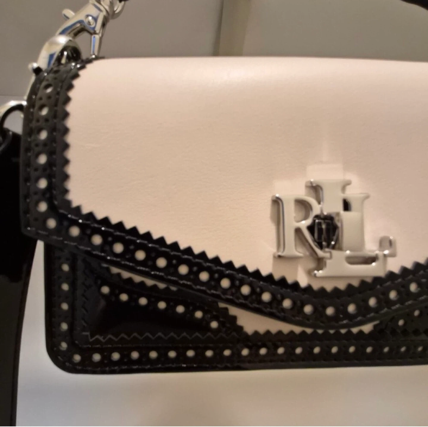 Elevate your look with this stunning and hard-to-find Lauren Ralph Lauren convertible bag, crafted in a luxurious mix of smooth white leather and glossy black patent leather with elegant perforated brogue detailing.