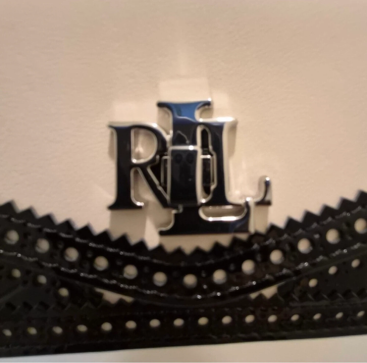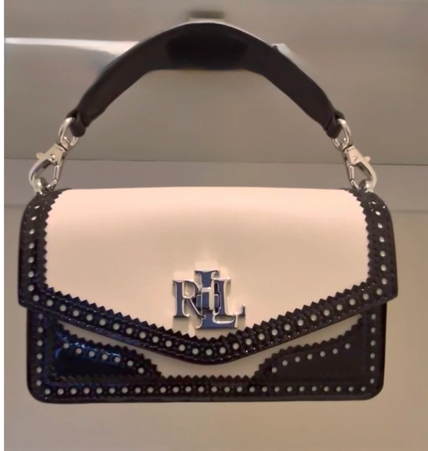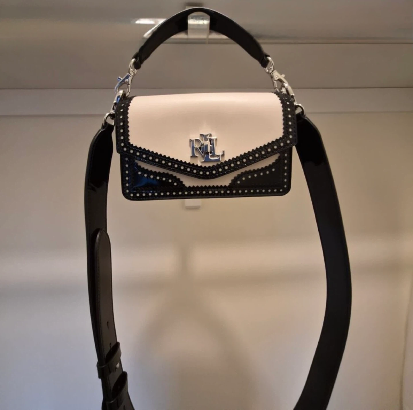 Elevate your look with this stunning and hard-to-find Lauren Ralph Lauren convertible bag, crafted in a luxurious mix of smooth white leather and glossy black patent leather with elegant perforated brogue detailing.