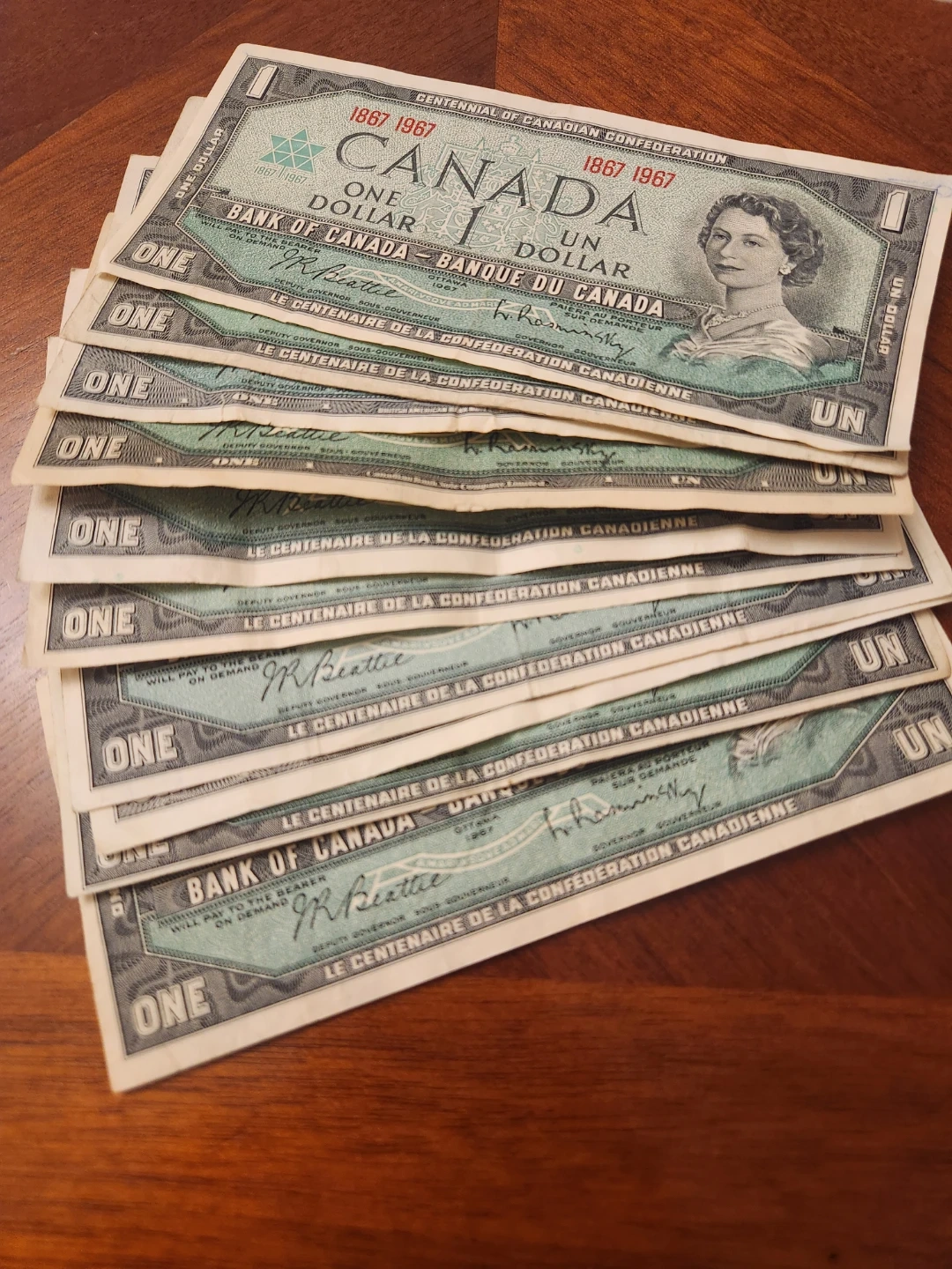 Centennial of Canadian Confederation one dollar banknotes. Features Queen Elizabeth II on the front and Parliament Hill on the back. Dates visible are 1967. Selling Separately @ $7 to $10 Depending on Condition, Viewing in Person by Appointment, Pick up in Brampton L6y4y5, Queen and Chinguacousy rd, Shipping Available on Prepaid plus Canada post. We will choose the Best for you!