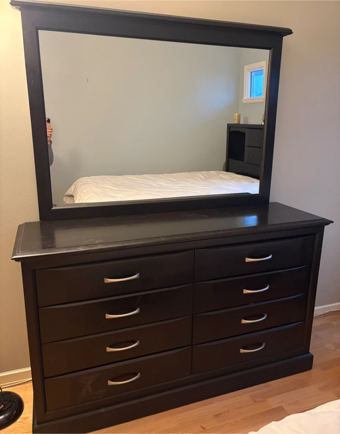 This is a dark wood dresser with a large attached mirror. It features eight drawers with silver handles for ample storage. The dresser is made of wood with a smooth, dark finish. It's a sturdy piece suitable for a bedroom.