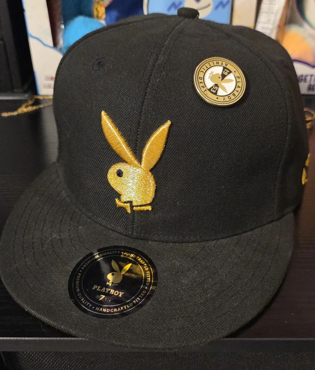 Selling a Playboy black fitted hat in size 7 1/4. It features the iconic Playboy bunny logo embroidered in gold on the front. A cool accessory to add to your collection!