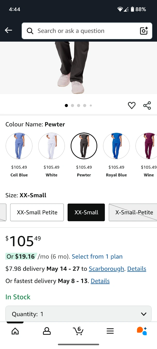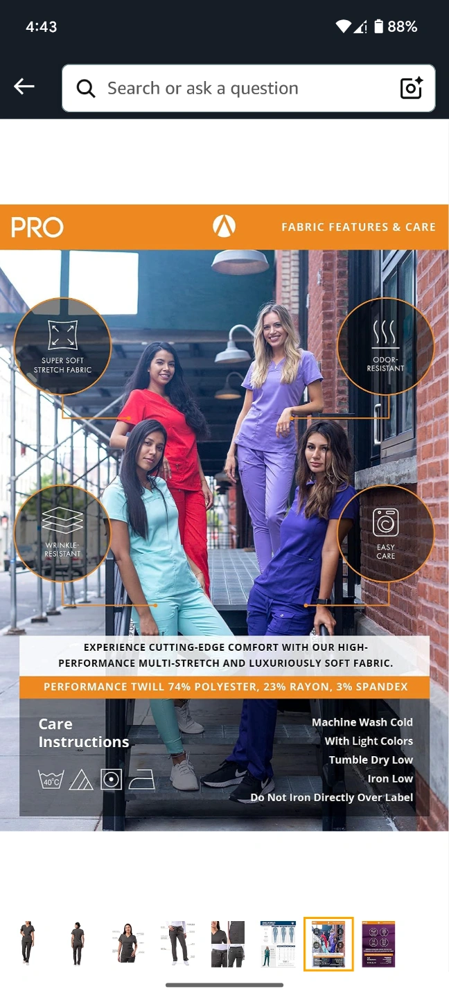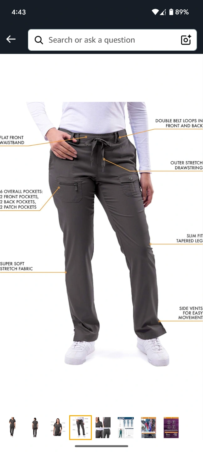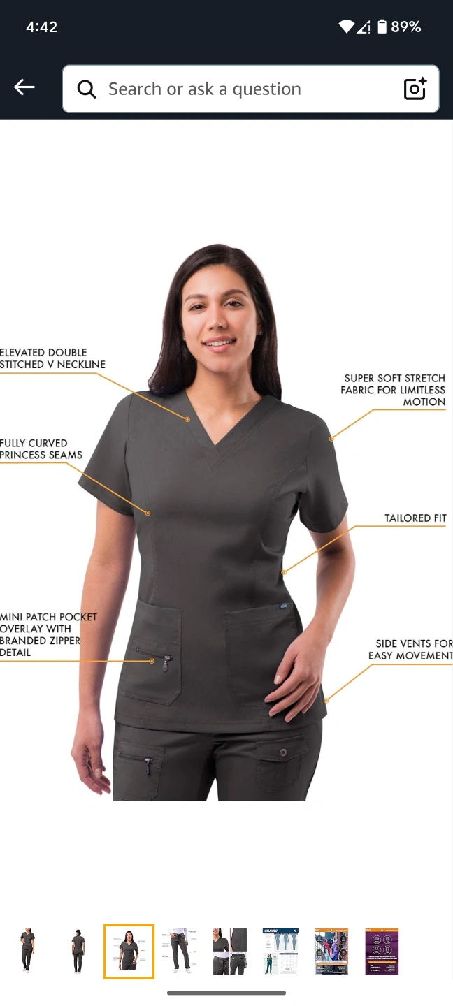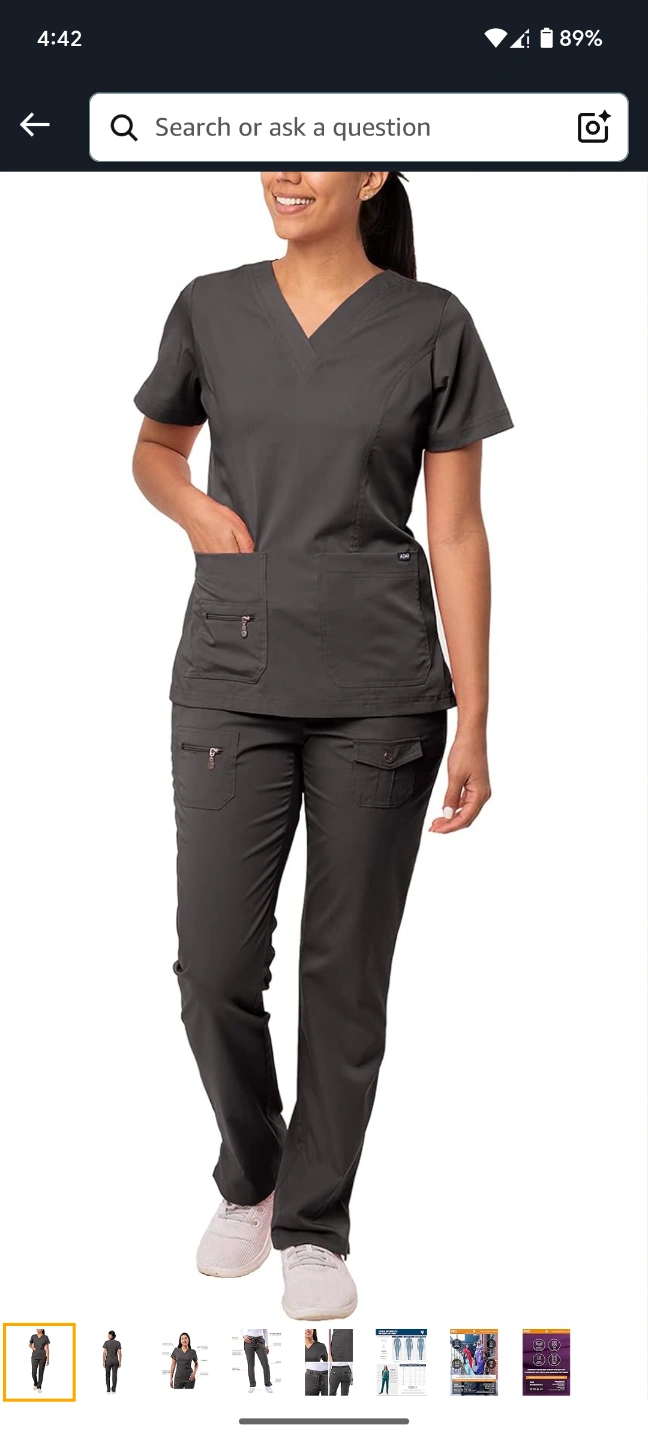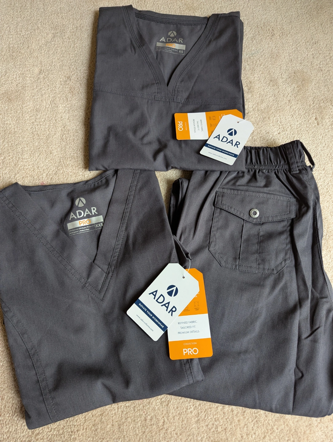 Comfortable, stylish pewter-coloured scrubs. Includes top and pants. Features multiple pockets and side vents. Stretchy and soft fabric. Excellent for healthcare professionals.