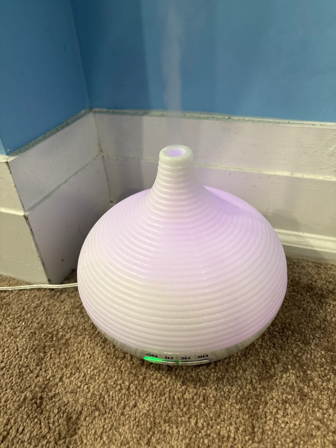 This Air humidifier has a ribbed design and adjustable mist settings with timer options for 1, 3, or 6 hours. It also features coloured LED lighting, cycling through various soft hues. This Air humidifier is great for creating a relaxing atmosphere in and Moistur the room.