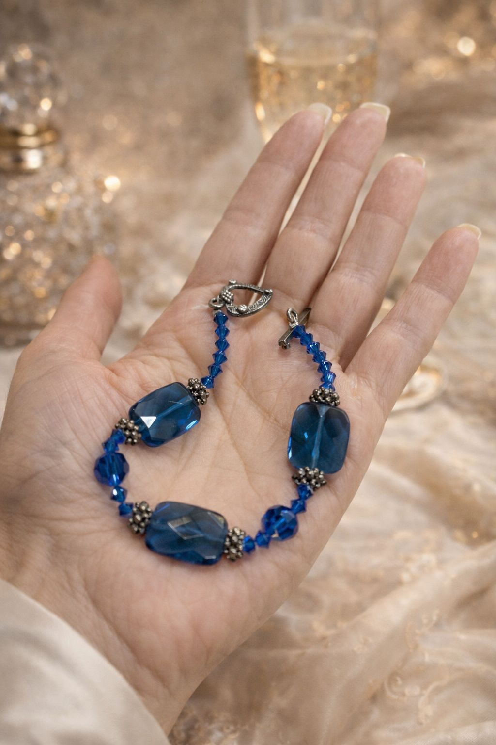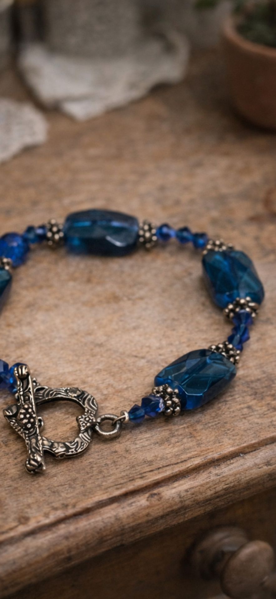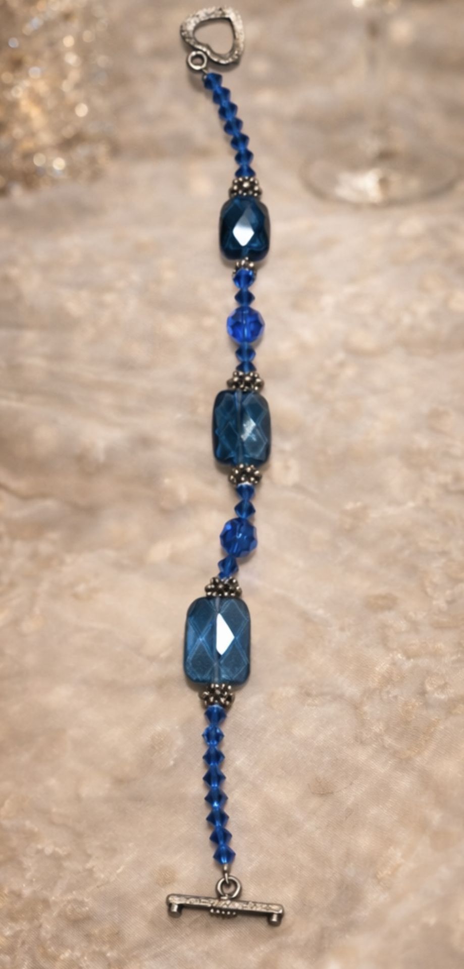 This beautiful handcrafted bracelet features rich, faceted teal-blue glass rectangle beads paired with sparkling royal blue crystal accents and detailed antique silver–tone spacer beads. The combination creates a timeless, elegant look with just the right amount of shimmer. Excellent condition. Finished with an ornate silver-tone toggle clasp, this bracelet feels secure, lightweight, and comfortable on the wrist. The design is symmetrical and thoughtfully assembled, giving it a refined artisan quality that makes it perfect for both everyday wear and special occasions.