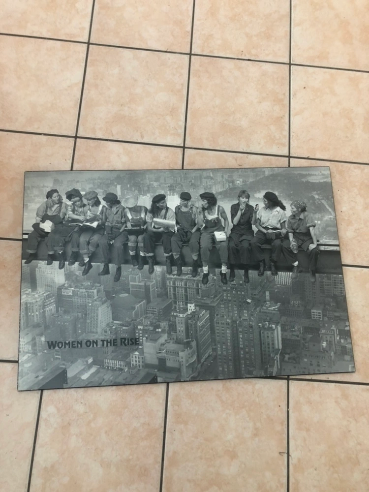 Black and white photo of women sitting on a beam of a building overlooking a city skyline. The print is already plaqued and ready to hang. The print reads "Women on the Rise."