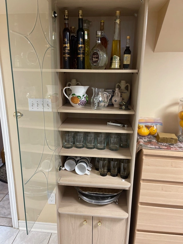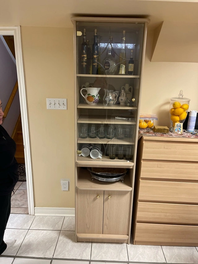 This is a used display cabinet with a glass door and multiple shelves, perfect for showcasing your prized possessions. It also includes a lower cabinet for additional storage. The condition is good, showing only minor signs of wear. This cabinet is a great addition to any living room or dining area.