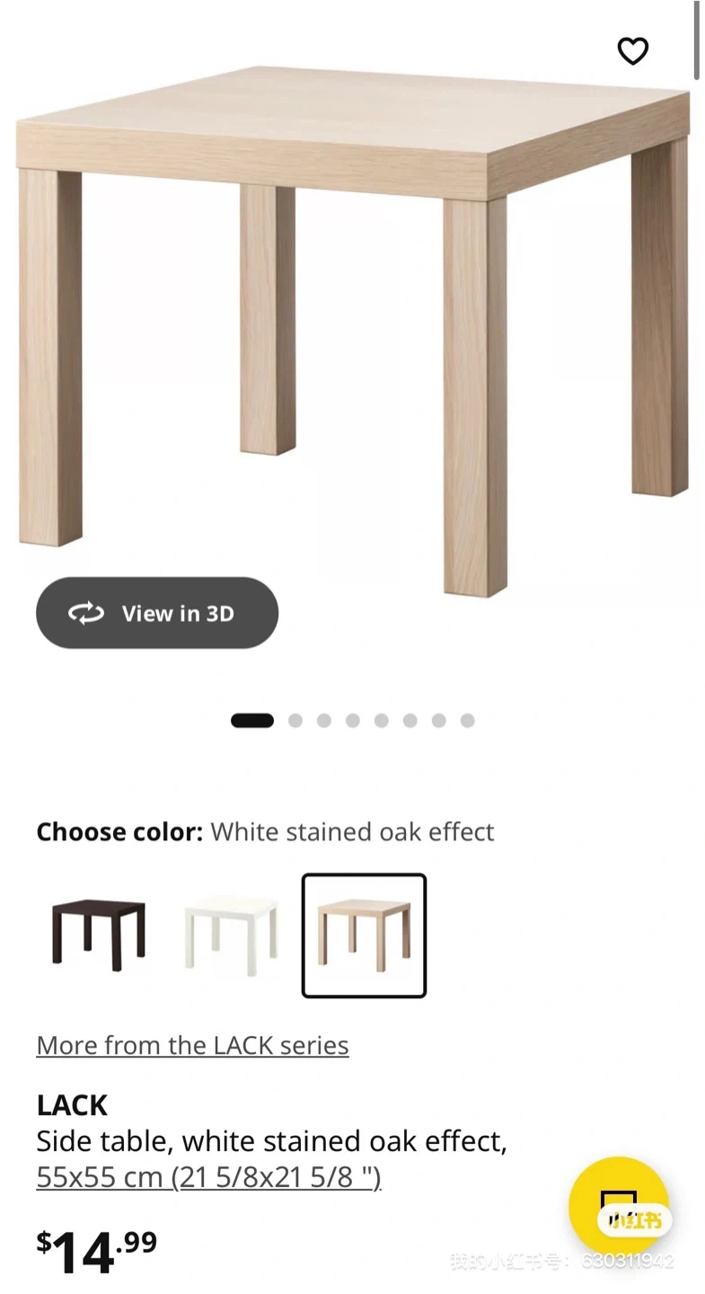 This is an IKEA LACK side table in a white stained oak effect finish. It measures 55x55 cm (approximately 21 5/8 x 21 5/8 inches). This table is a handy size for beside a couch or bed. Easy to wipe clean!