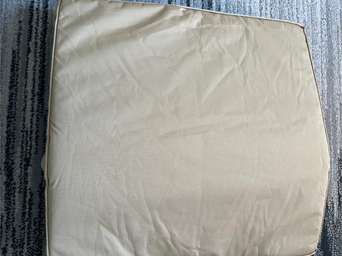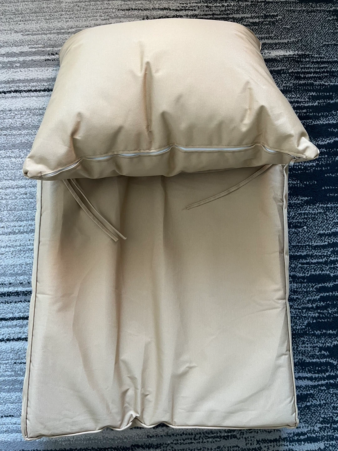 A set of outdoor cushions in a neutral beige colour. Comes with one large seat cushion and a back cushion. The fabric appears to be water-resistant and durable. Includes ties to secure them in place. The cushions are firm. Pick up only.