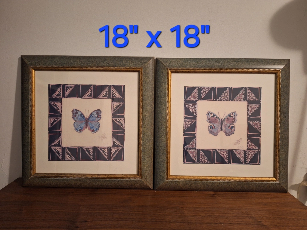 Two framed butterfly prints, each measuring 18" x 18". These pieces would add a touch of nature-inspired charm to any room
