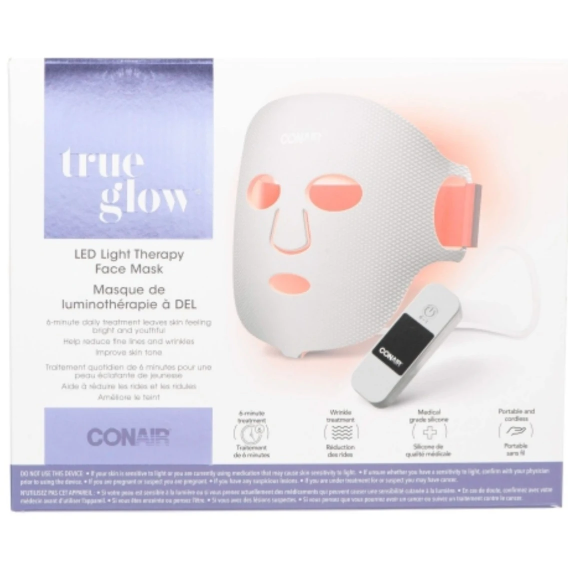 The Conair True Glow Wireless LED Light Therapy Face Mask uses advanced LED light therapy to help improve skin tone, reduce fine lines, and enhance radiance in just a few minutes daily. Comfortable and cordless with soft silicone and adjustable straps, it offers an at-home spa-like skin treatment experience.