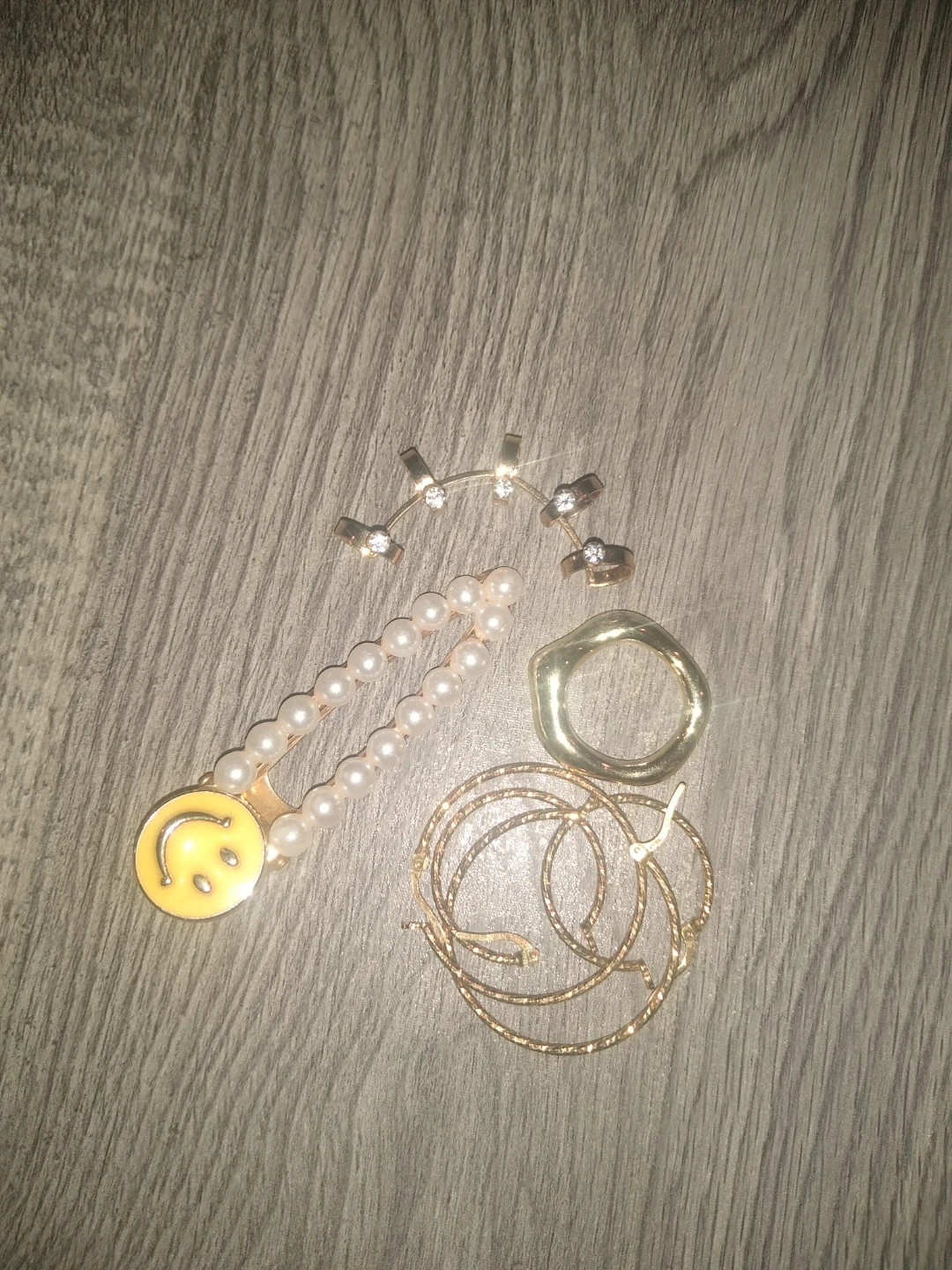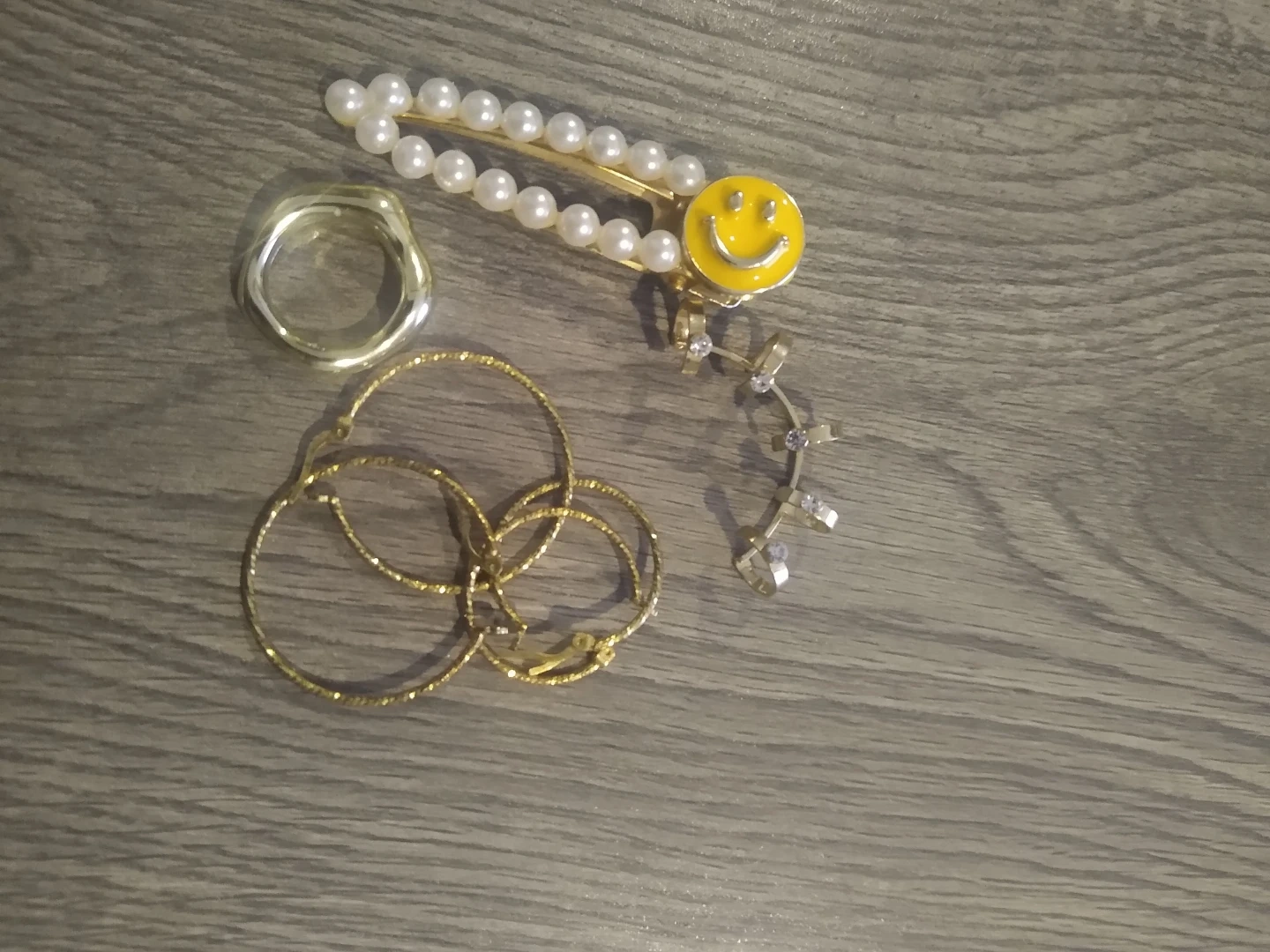 A cute jewelry set featuring a pearl and smiley face hair clip, hoop earrings, and various rings. Adds a fun touch to any outfit!