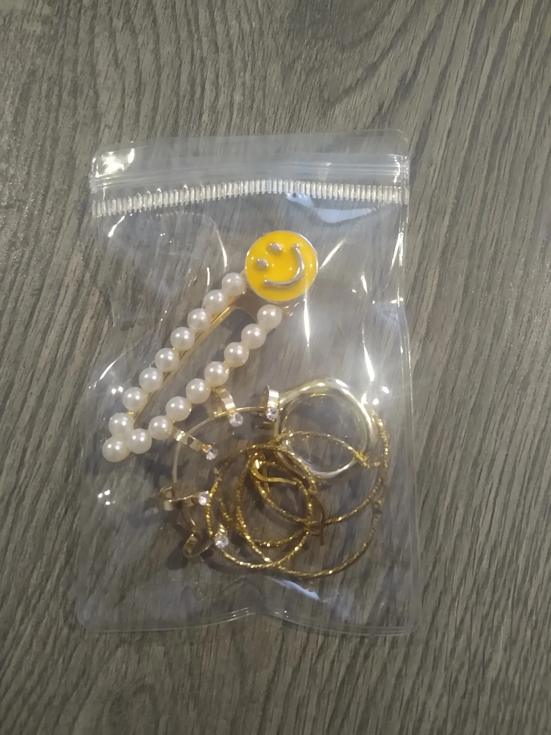 A cute jewelry set featuring a pearl and smiley face hair clip, hoop earrings, and various rings. Adds a fun touch to any outfit!