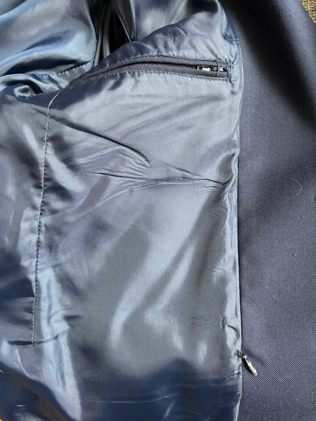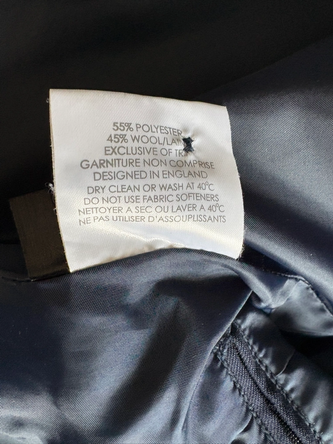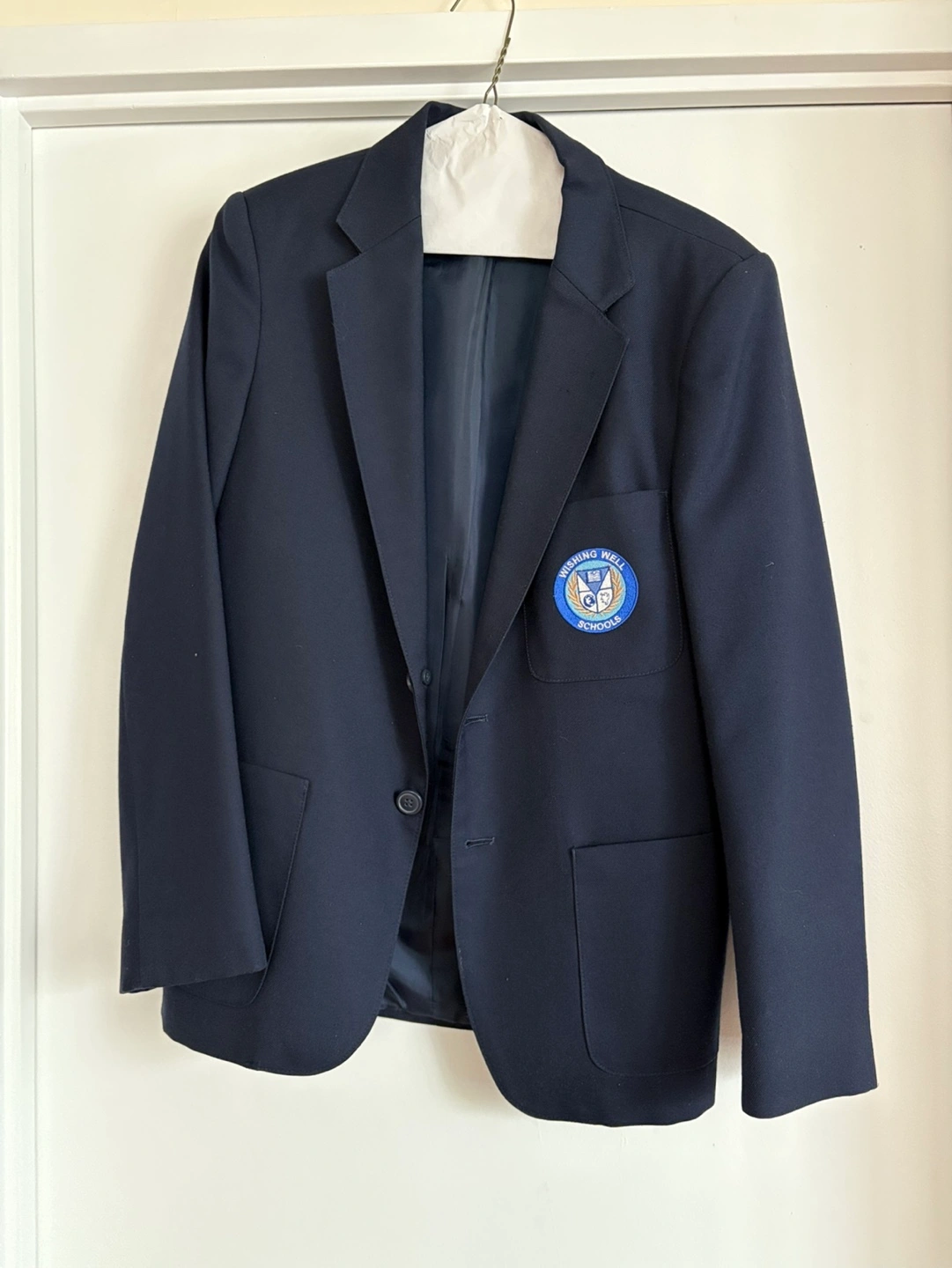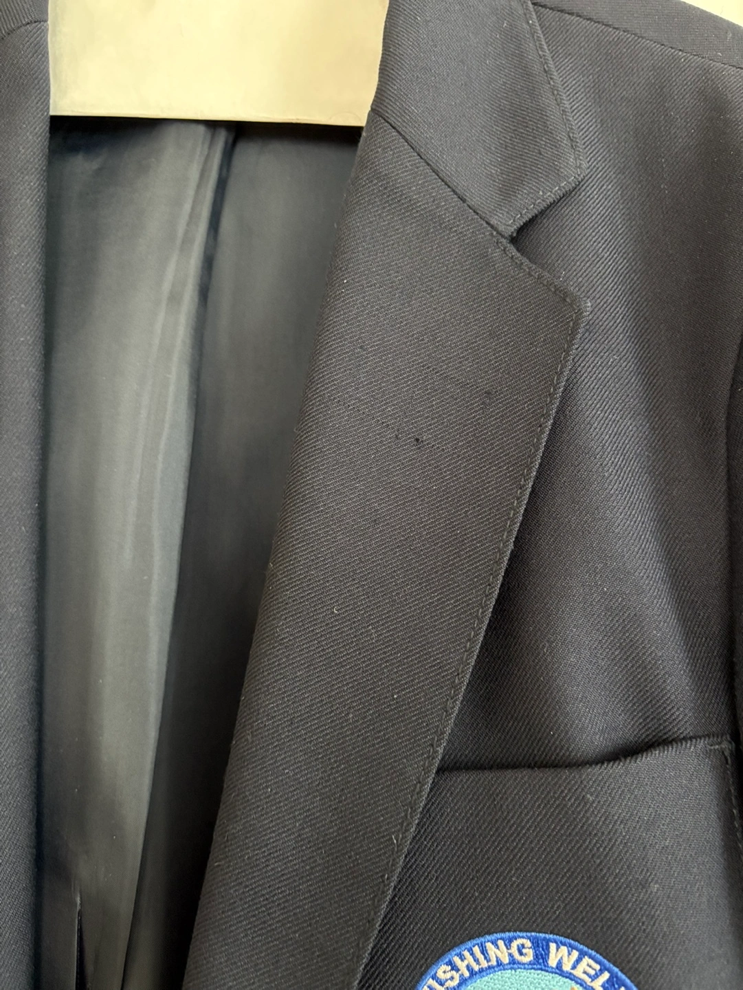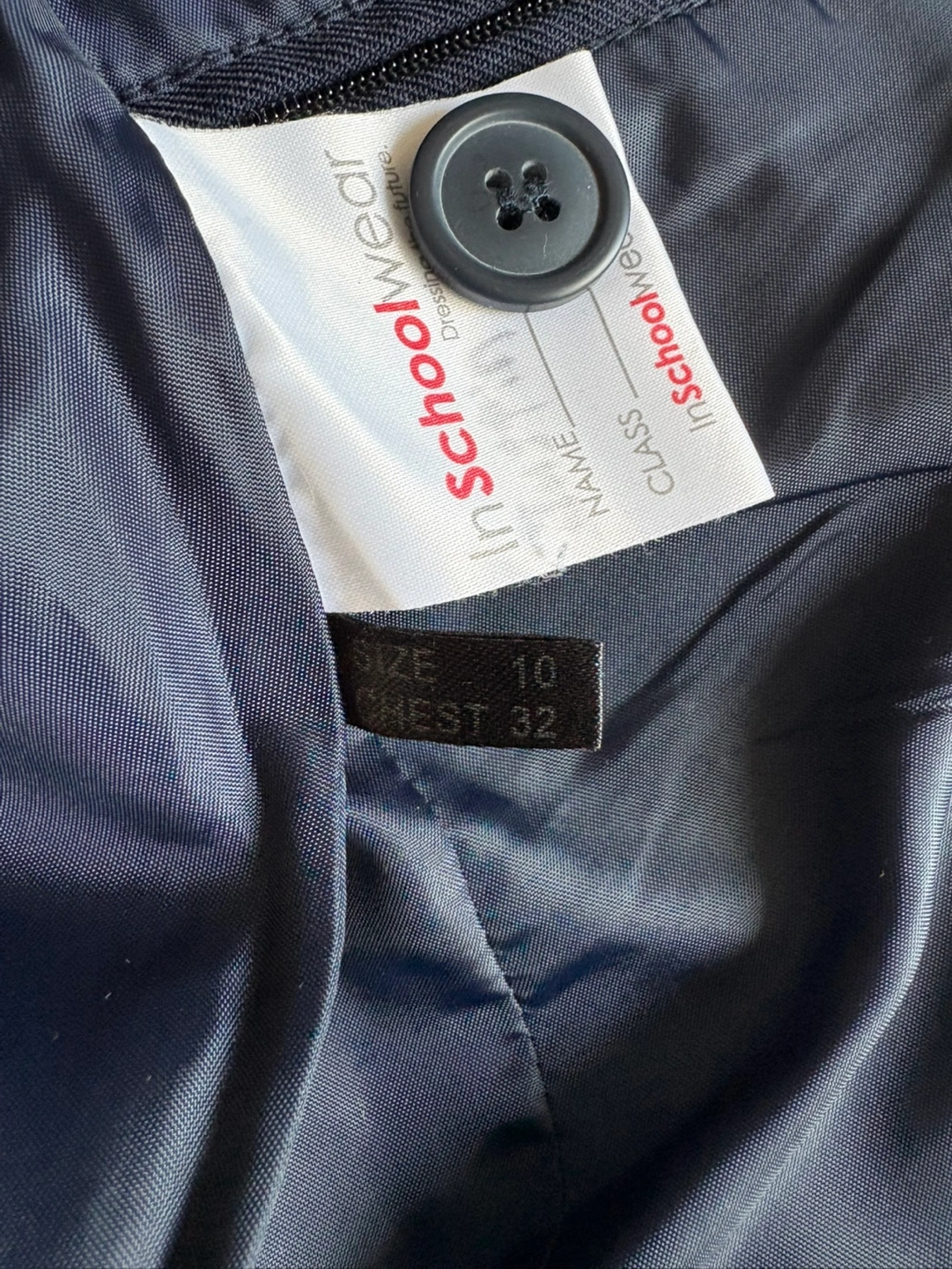 Navy blue school blazer. Features a school crest. Two pockets. 55% polyester, 45% wool/acrylic blend. Dry clean or machine wash at 40°C. Designed in England.