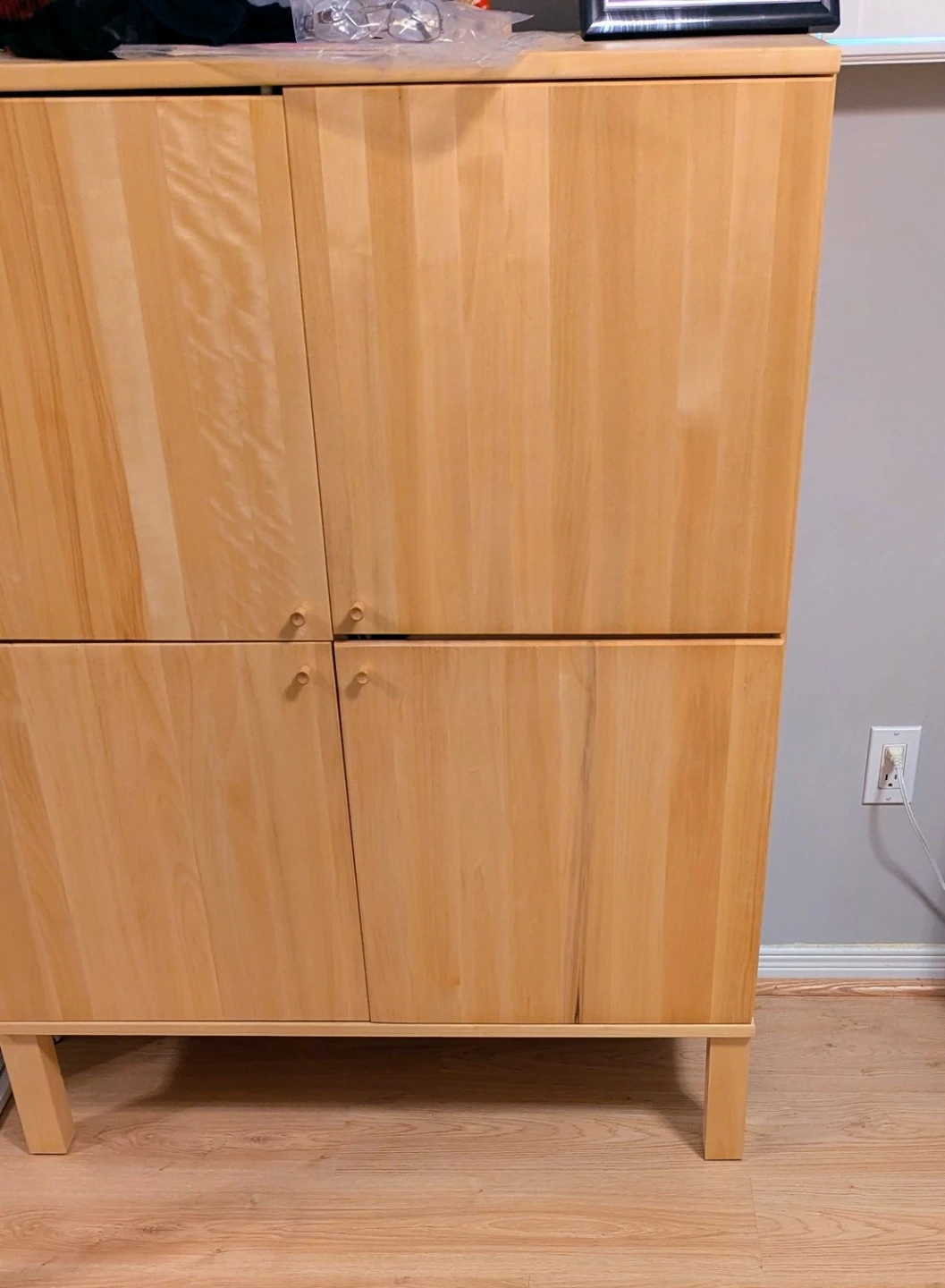 This is a light wood cabinet with four doors. It's made of wood and has simple wooden knobs. It's a great storage piece for any room.