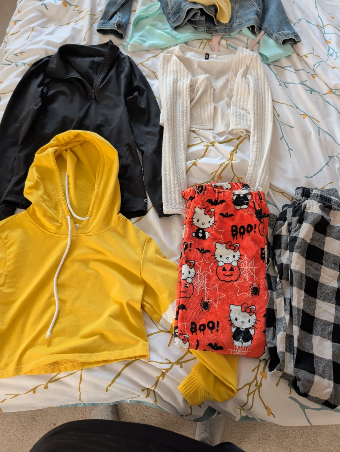 This bundle includes a black quarter-zip top, a white textured cropped cardigan, a yellow cropped hoodie, orange Hello Kitty Halloween pajama pants, and black and white plaid pants. Various sizes are represented, and the items are generally in good condition.