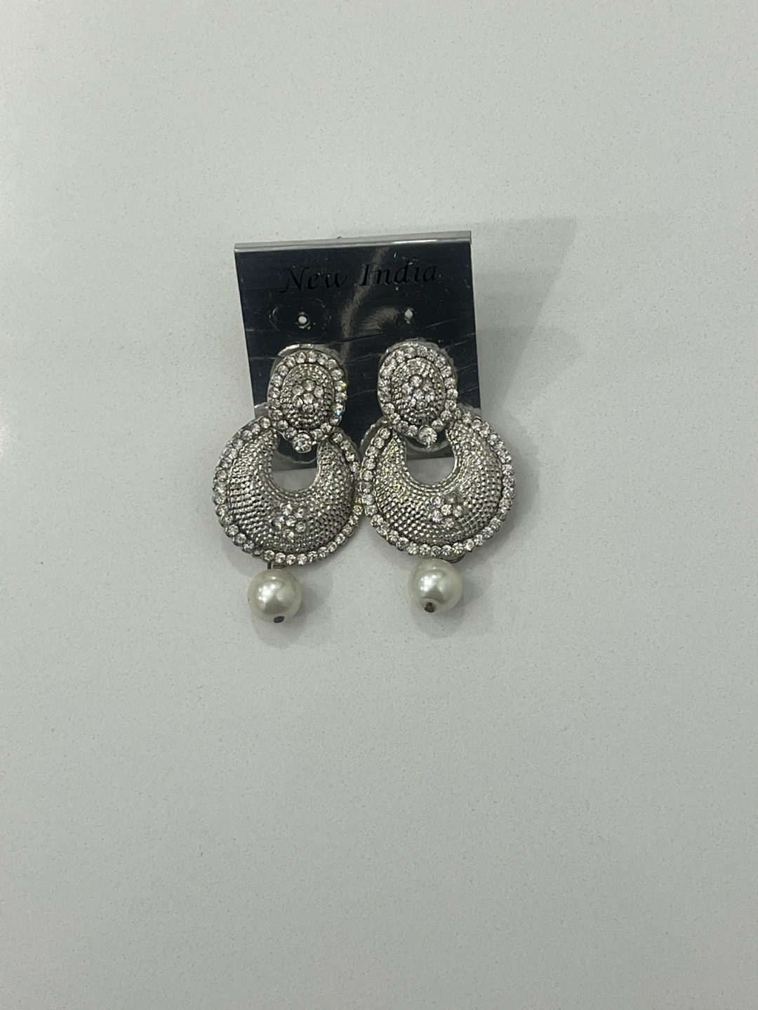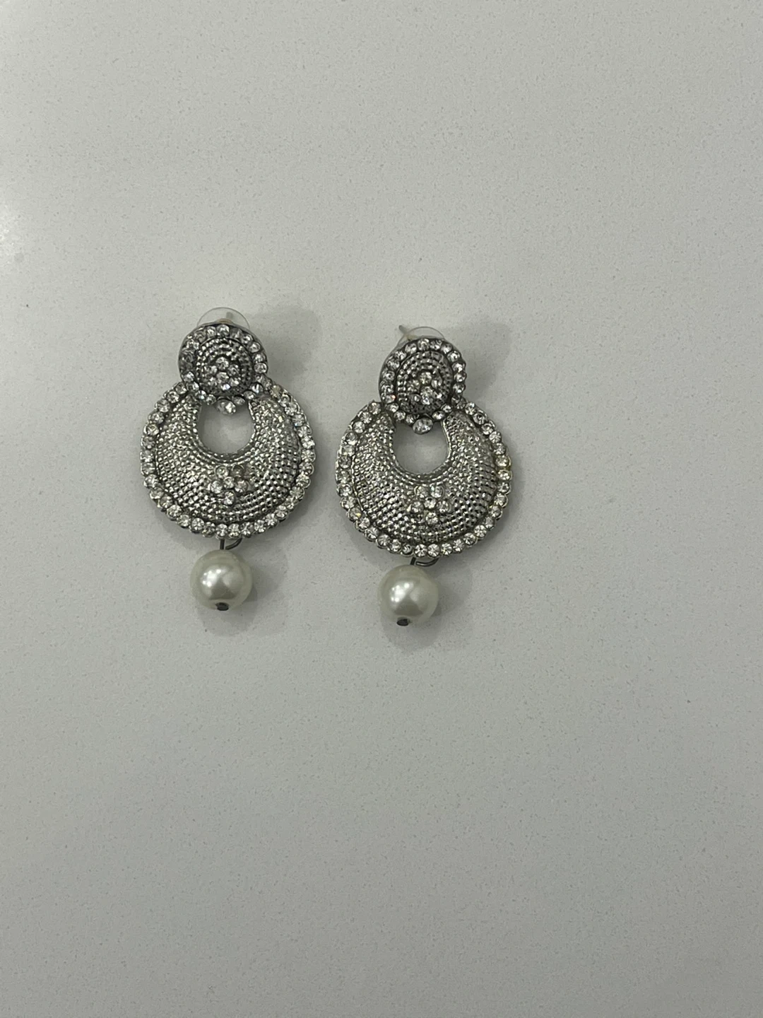 Sparkling silver tone drop earrings adorned with pearls and clear crystal accents. They feature a decorative circular top with intricate detailing and a dangling faux pearl.