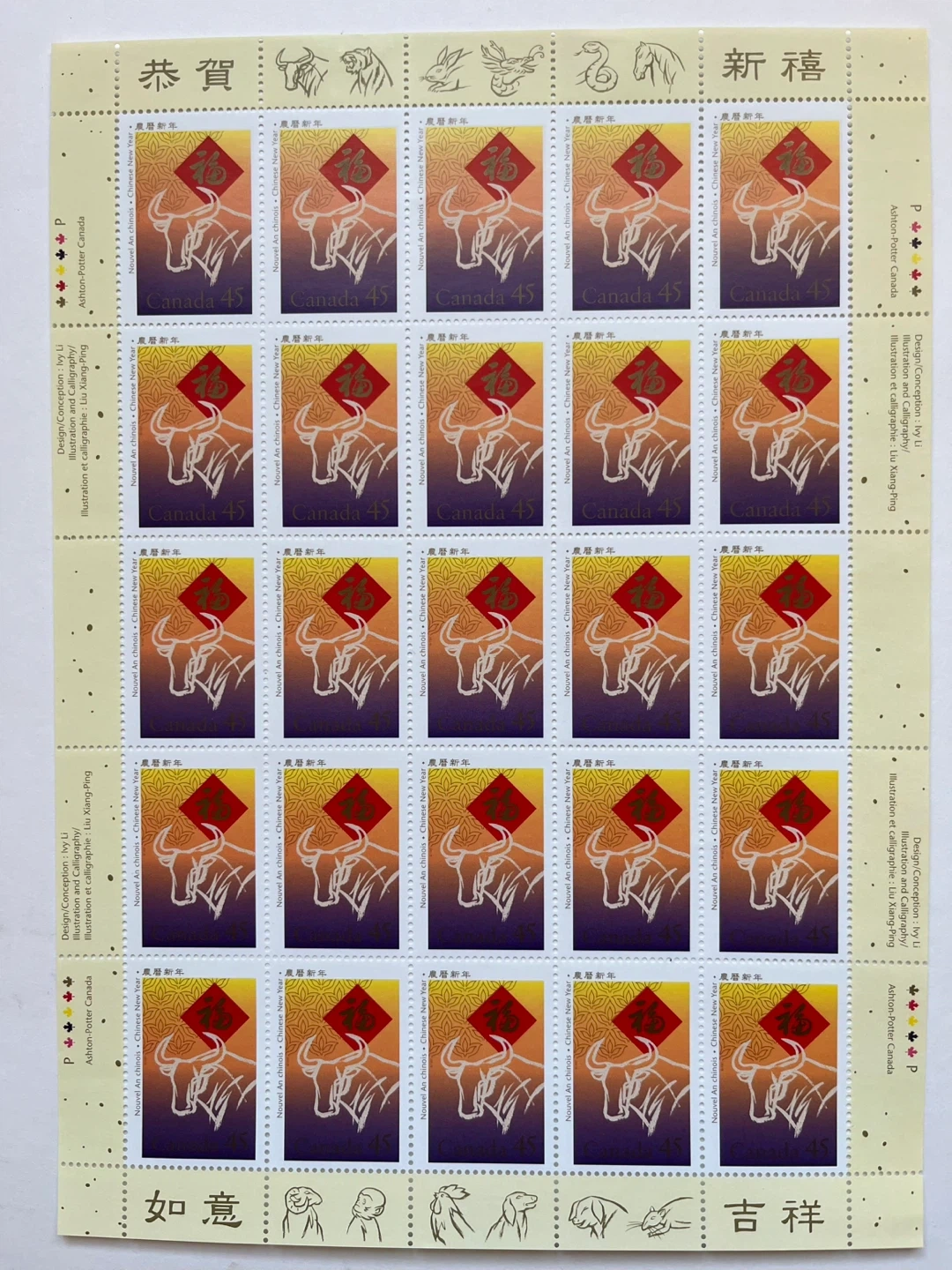 This is a full pane of Canada Post 1997 Lunar New Year, “Year of the Ox” 45-cent stamps.