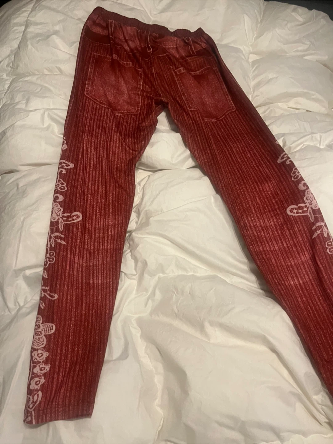 Comfy elastic waist leggings with a red denim-like print and white floral detailing down the sides. These are a size medium and made of a soft, stretchy material.