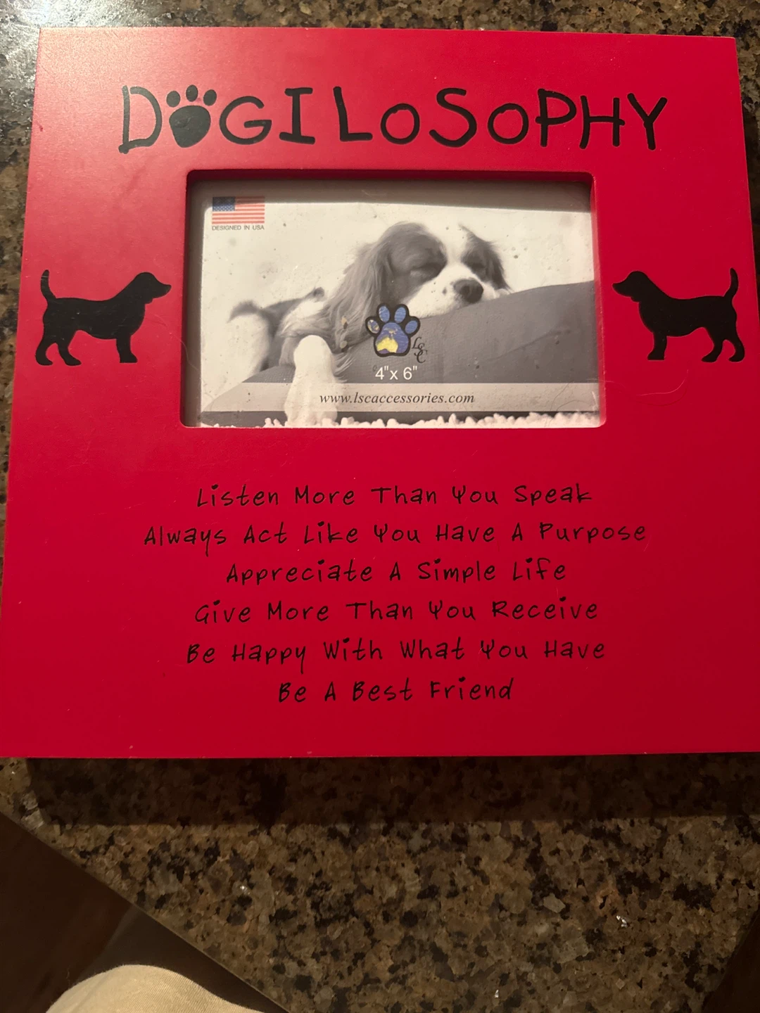 Cute Dogilosophy picture frame for a 4x6 photo. It's red and has some nice sayings on it like "Listen More Than You Speak" and "Be Happy With What You Have"