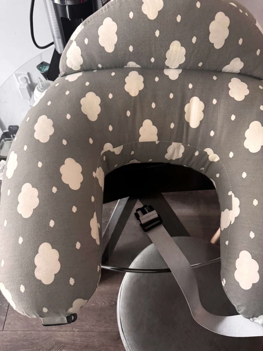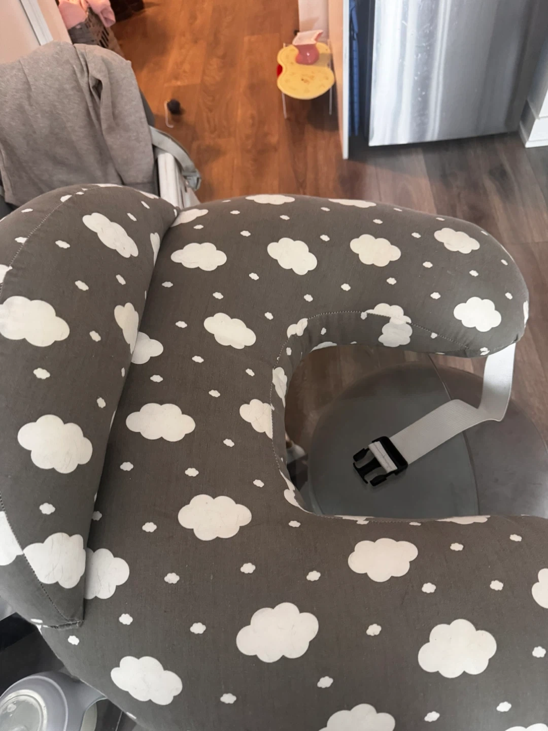 This is a Momcozy nursing pillow with a cloud pattern. It's made of 100% cotton. The pillow is designed for ages 0+ years. It's great for supporting babies during feeding time.