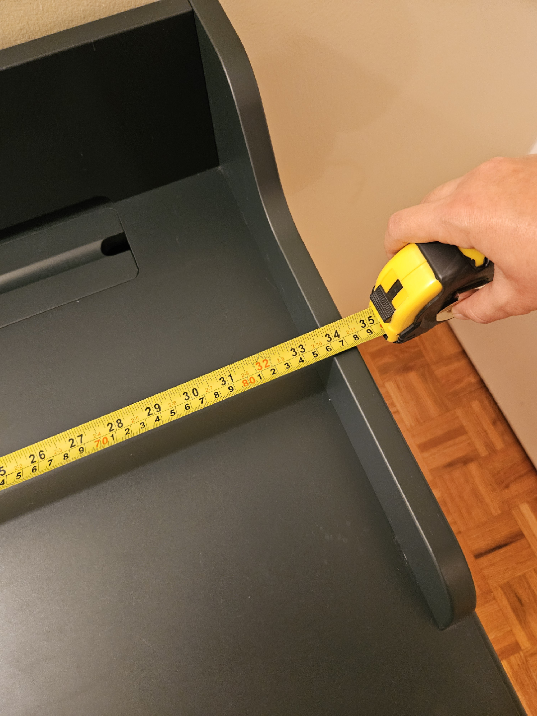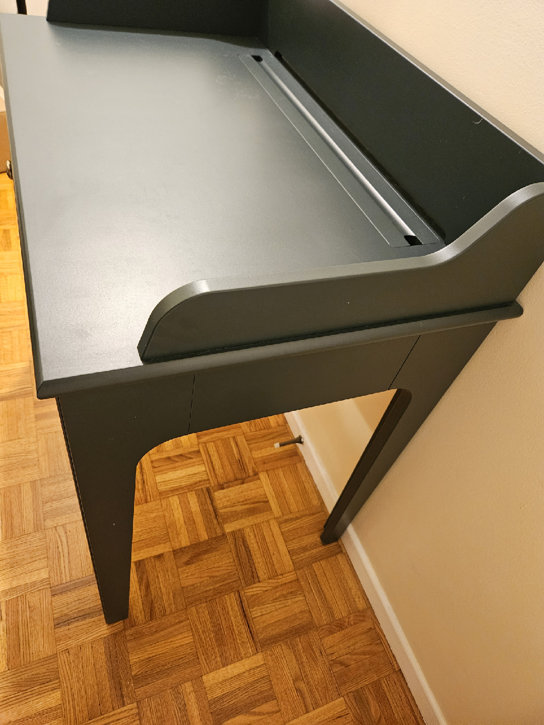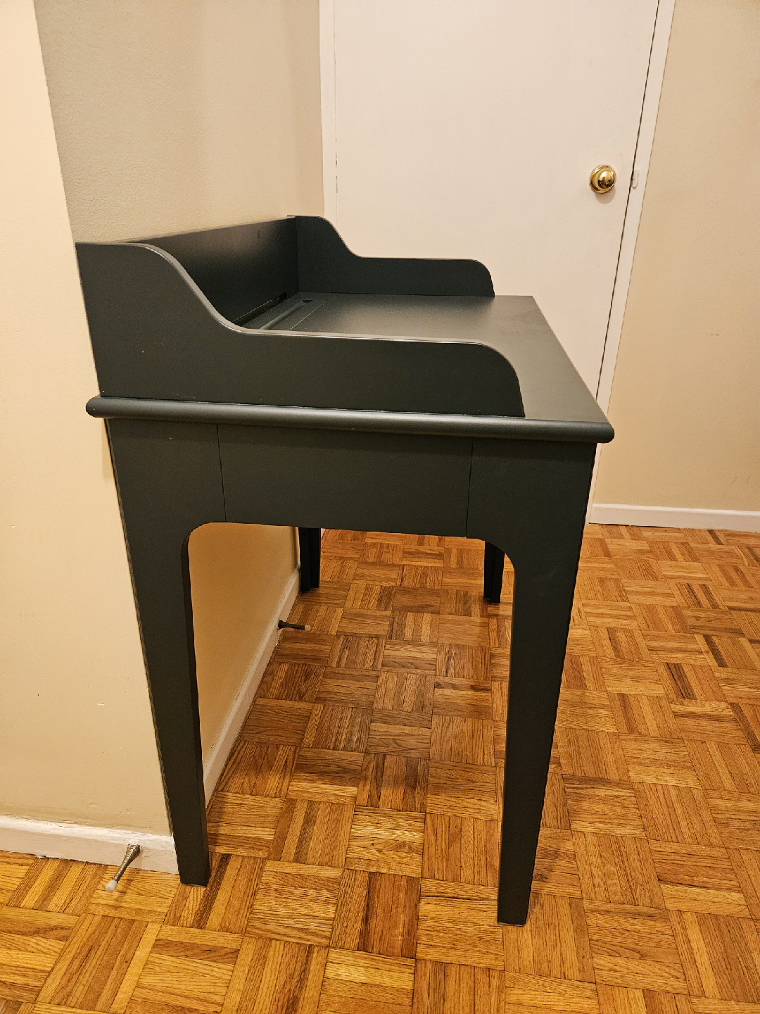 Here's a lovely desk! It features a single drawer and a unique design. In great shape, no dents or scratches (just needs a bit of a deep clean), and the drawer still works without issue. I'm only getting rid of it because I found a desk that I like better. Perfect for a small workspace or as an accent piece in your home.