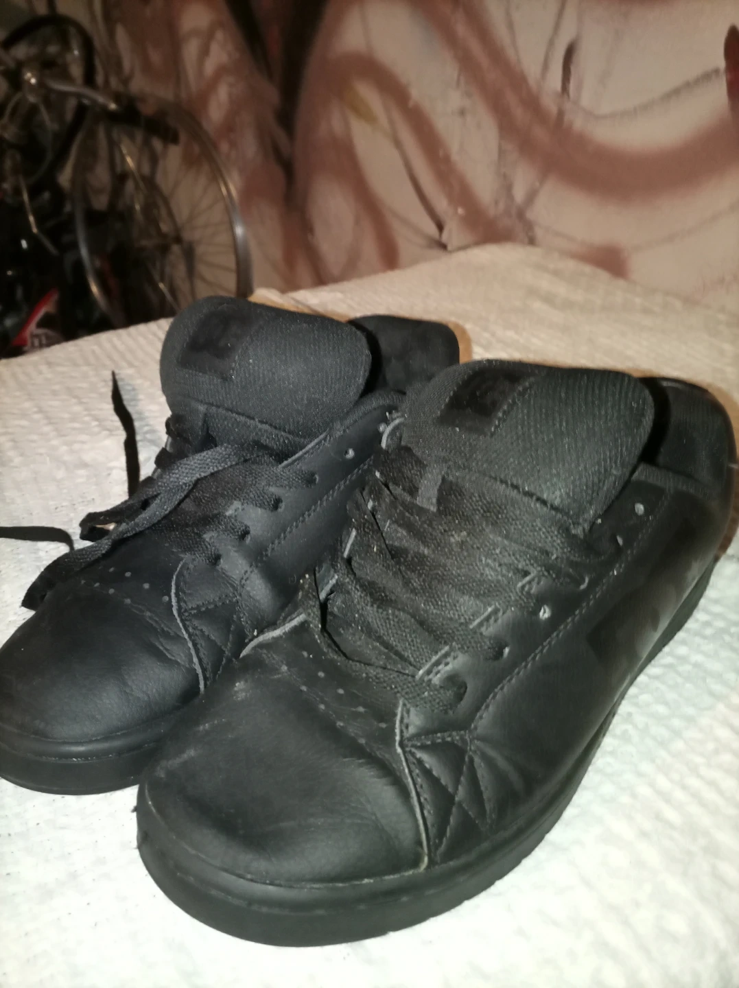 Selling a pair of DC Men's Gaveler shoes in black. They are size 9 US. There is some wear and tear on the inside of the shoes. And the bottom sole is getting a little thin.