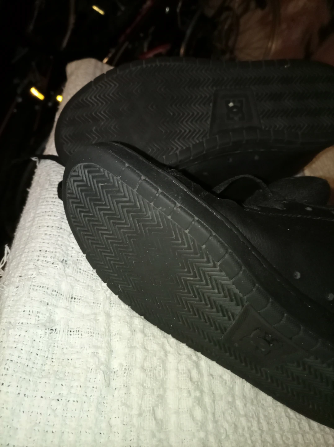 Selling a pair of DC Men's Gaveler shoes in black. They are size 9 US. There is some wear and tear on the inside of the shoes. And the bottom sole is getting a little thin.