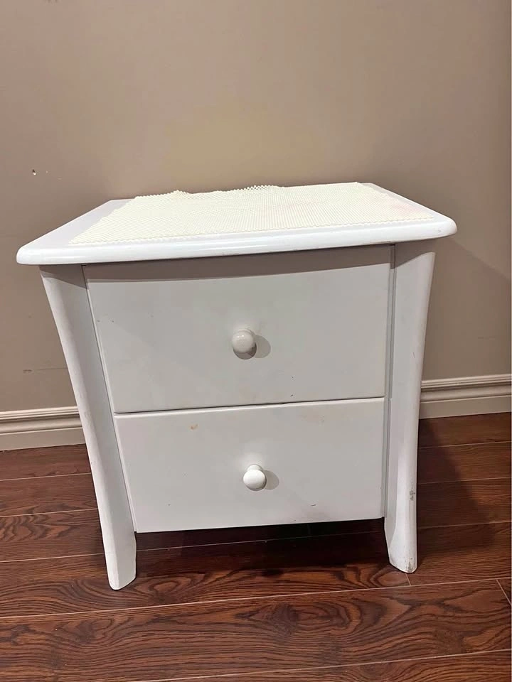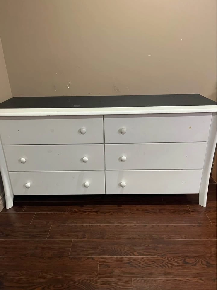 White dresser and nightstand set. Dresser has 6 drawers. Nightstand has 2 drawers. Both have white round knobs. Dresser has 4 knobs missing but I have 3 and it can be fixed. Need it gone ASAP. Can send more pictures if needed.