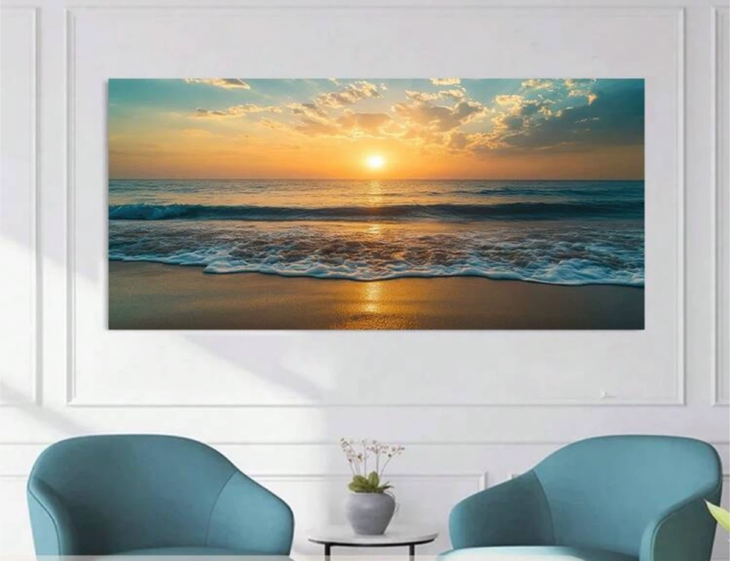 Beautiful canvas print depicting a vibrant sunset over the ocean with waves crashing on the shore. It's a relaxing scene that brings a piece of paradise indoors! The artwork is ready to hang and would liven up any room.