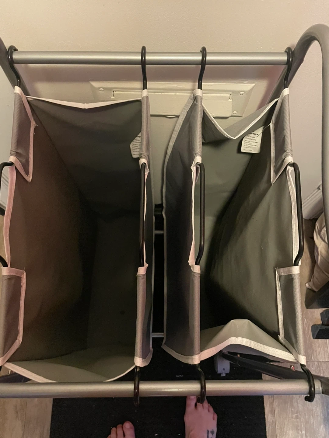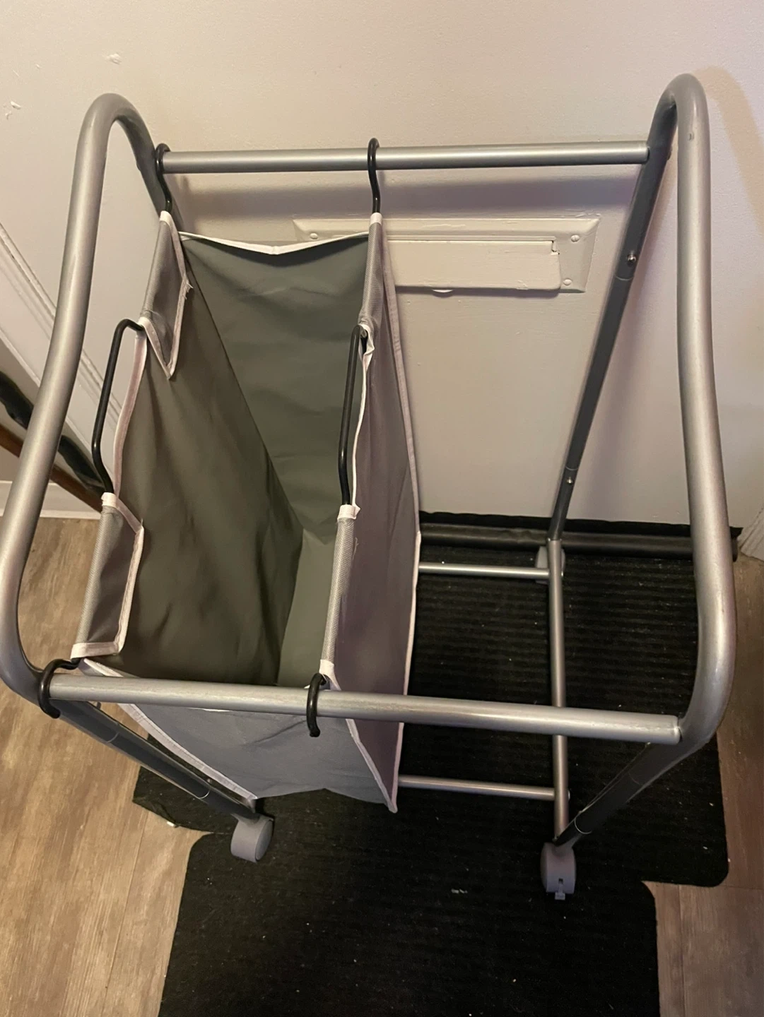 This double laundry hamper is made of a metal frame and fabric compartments. It measures 16" L x 17" W x 31.5" H. It's equipped with wheels for easy transport. Great for sorting laundry!