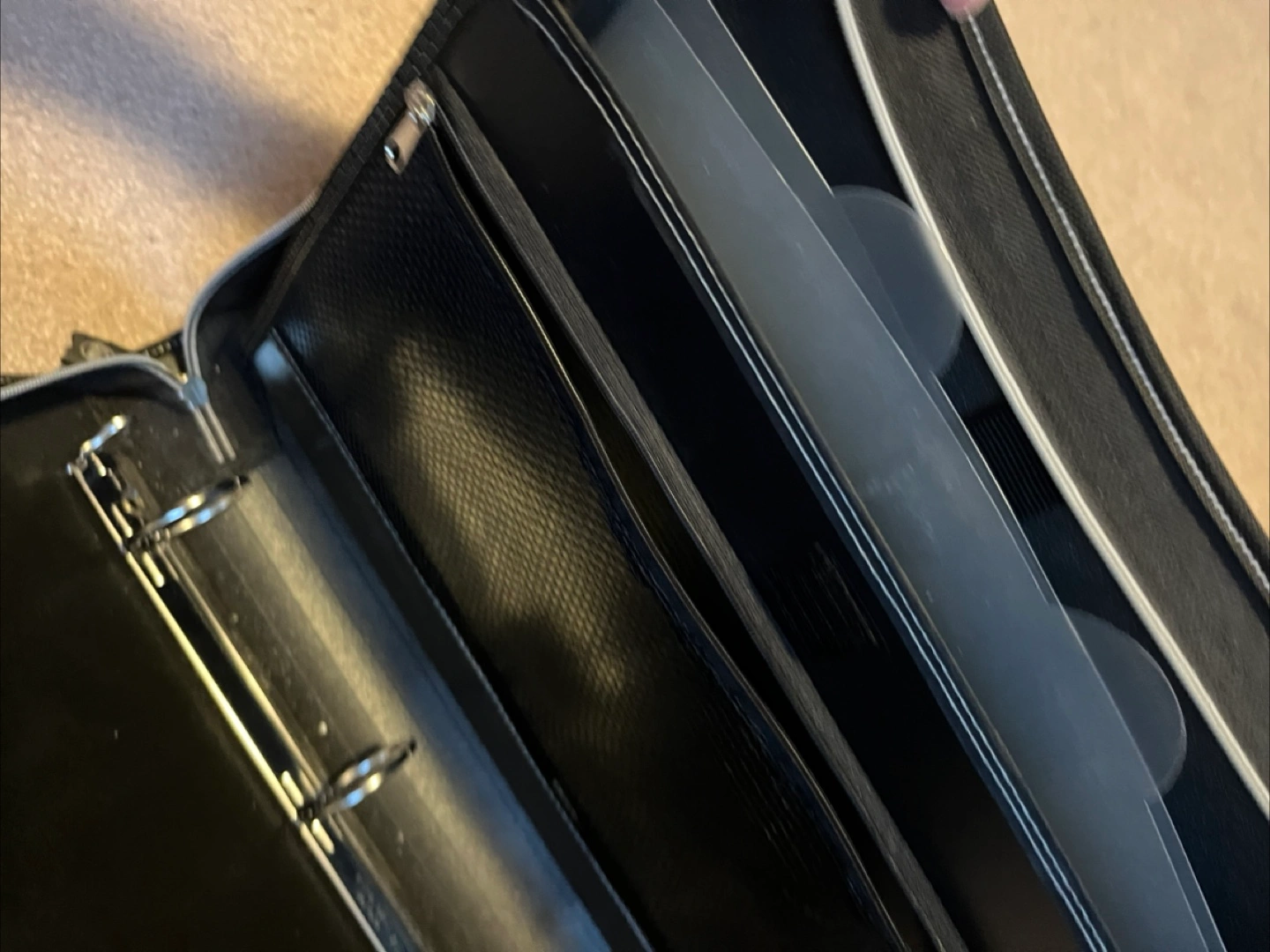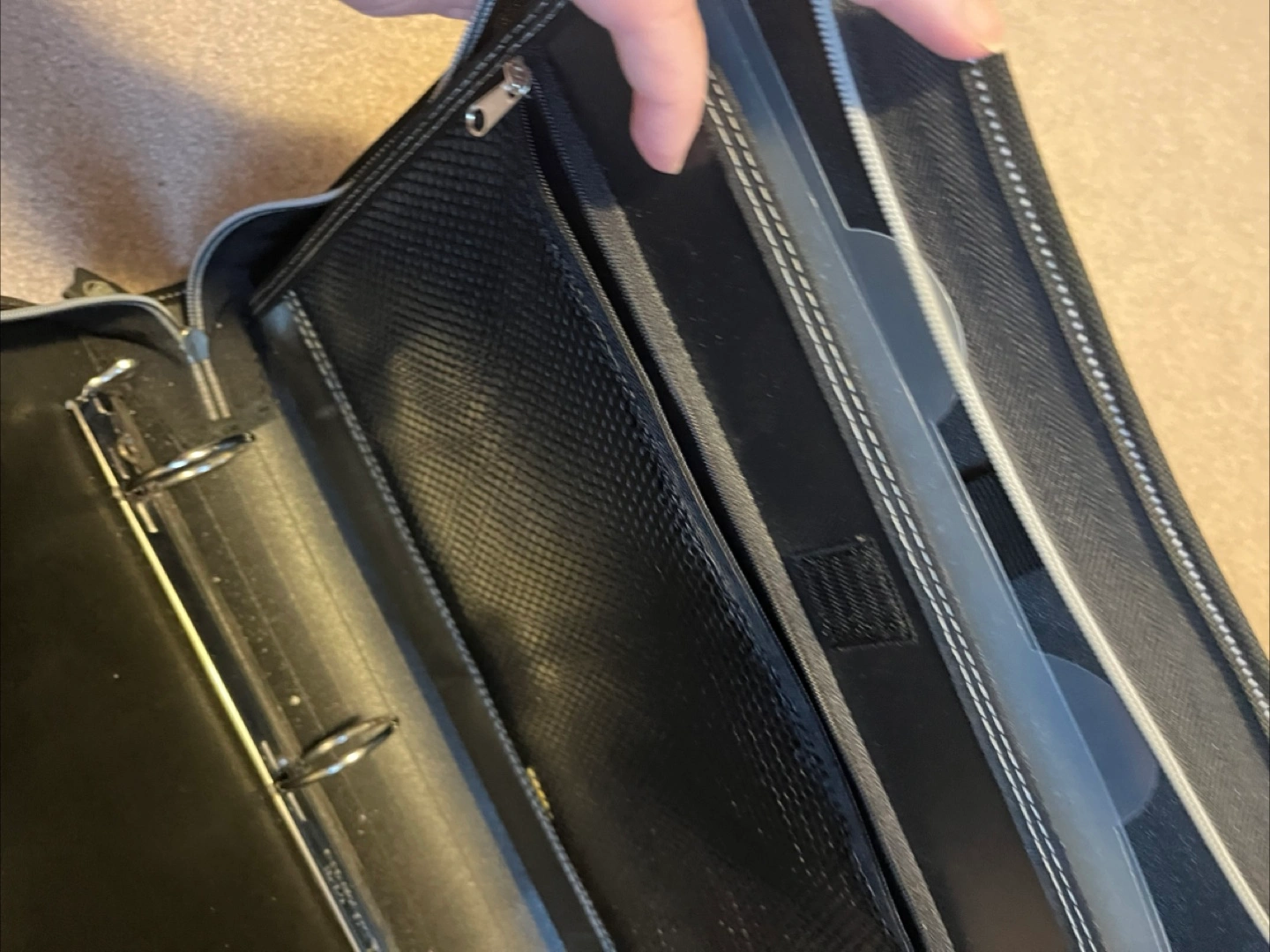 It's black with red accents and features a zipper closure. Inside, there are several dividers to keep your documents organized.