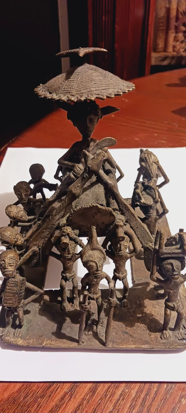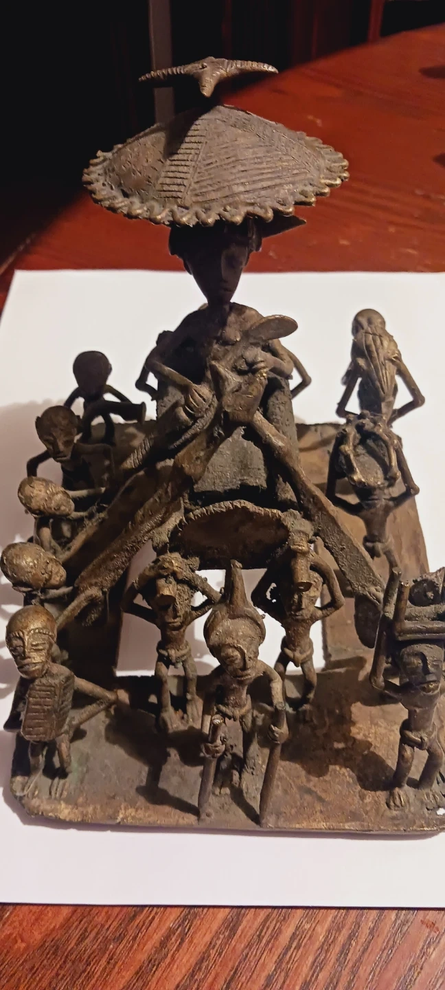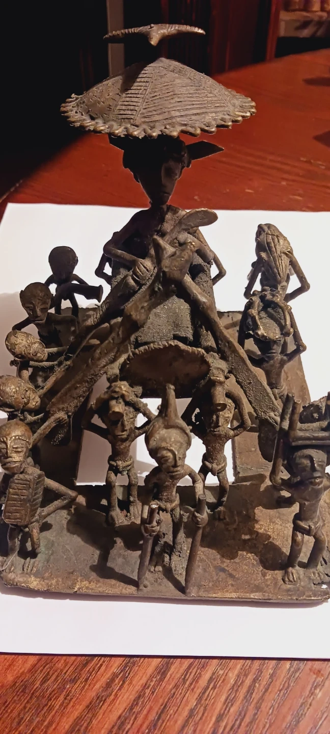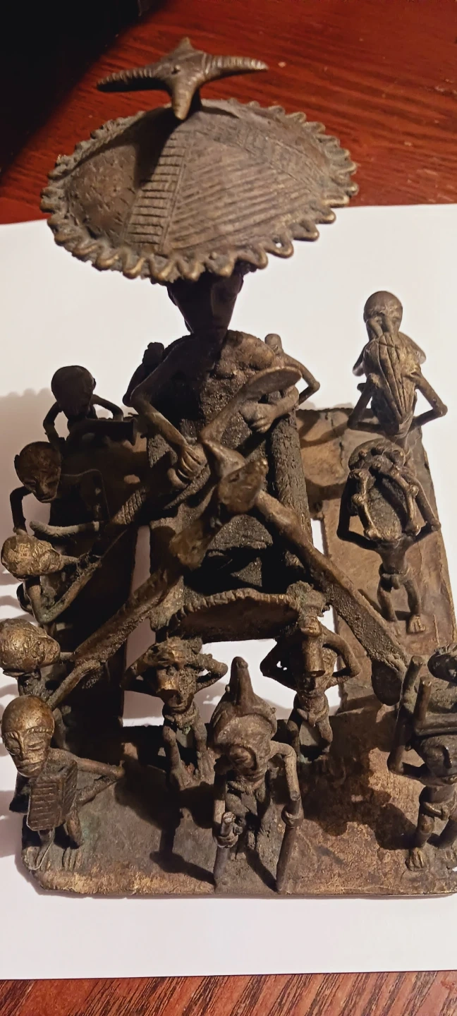 African Cast Bronze Sculpture Kuduo Ashanti Tribal Figurine from Ghana 🇬🇭. This bronze sculpture depicts a central figure surrounded by smaller figures. It has a rustic, aged patina and intricate details throughout the composition. A unique decorative piece for display! Handmade in Ghana 🇬🇭. Excellent condition. ALL MY PRICES ARE NEGOTIABLE !! 9"×7"×6".