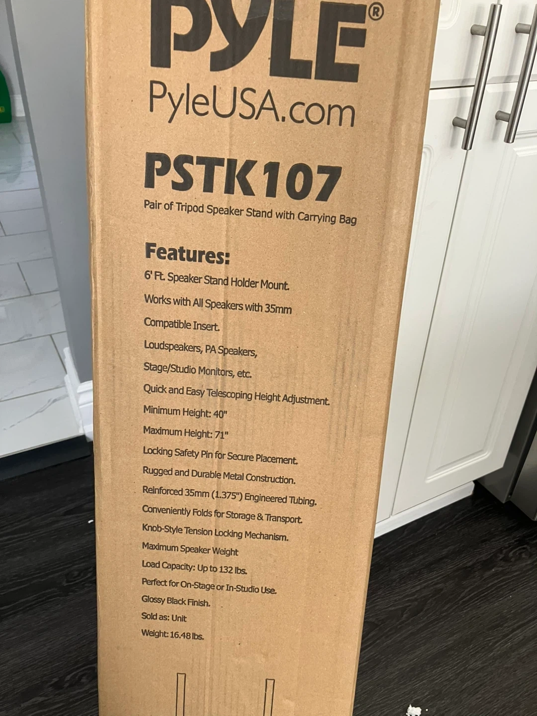 This is a Pyle PSTK107 tripod speaker stand. It extends up to 6 feet and includes a carrying bag for easy transport. The stand features rugged and durable metal construction with a glossy black finish. It's perfect for on-stage or in-studio use, supporting up to 132 lbs.